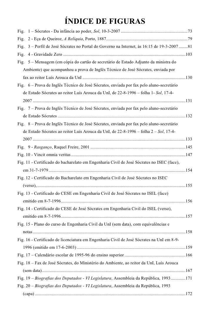 9. 9. ÍNDICE DE FIGURAS Fig. 1 – Sócrates - Da infância ao poder, Sol, 10-3-2007 ...........................................................73 Fig. 2 - Eça de Queiroz, A Relíquia, Porto, 1887........................................................................79 Fig. 3 – Perfil de José Sócrates no Portal do Governo na Internet, às 16:15 de 19-3-2007 ........81 Fig. 4 - Gravidade Zero ............................................................................................................103 Fig. 5 – Mensagem (em cópia do cartão de secretário de Estado Adjunto da ministra do Ambiente) que acompanhou a prova de Inglês Técnico de José Sócrates, enviada por fax ao reitor Luís Arouca da UnI ...........................................................................................130 Fig. 6 – Prova de Inglês Técnico de José Sócrates, enviada por fax pelo aluno-secretário de Estado Sócrates ao reitor Luís Arouca da UnI, de 22-8-1996 – folha 1- Sol, 17-4- 2007 .......................................................................................................................................131 Fig. 7 – Prova de Inglês Técnico de José Sócrates, enviada por fax pelo aluno-secretário de Estado Sócrates .................................................................................................................132 Fig. 8 – Prova de Inglês Técnico de José Sócrates, enviada por fax pelo aluno-secretário de Estado Sócrates ao reitor Luís Arouca da UnI, de 22-8-1996 – folha 2 – Sol, 17-4- 2007 .......................................................................................................................................133 Fig. 9 - Rasganço, Raquel Freire, 2001 ....................................................................................145 Fig. 10 - Vincit omnia veritas .....................................................................................................147 Fig. 11 - Certificado do bacharelato em Engenharia Civil de José Sócrates no ISEC (face), em 31-7-1979 .........................................................................................................................154 Fig. 12 - Certificado do Bacharelato em Engenharia Civil de José Sócrates no ISEC (verso), ...................................................................................................................................155 Fig. 13 - Certificado do CESE em Engenharia Civil de José Sócrates no ISEL (face) emitido em 8-7-1996 ..............................................................................................................156 Fig. 14 - Certificado do CESE de José Sócrates em Engenharia Civil do ISEL (verso), emitido em 8-7-1996 ..............................................................................................................157 Fig. 15 - Plano do curso de Engenharia Civil da UnI (sem data), com equivalências e notas .......................................................................................................................................158 Fig. 16 - Certificado de licenciatura em Engenharia Civil de José Sócrates na UnI em 8-9- 1996 (emitido em 17-6-2003) ................................................................................................159 Fig. 17 – Calendário escolar de 1995-96 do ensino superior ......................................................166 Fig. 18 – Fax de José Sócrates, do Ministério do Ambiente, ao reitor da UnI, Luís Arouca (sem data) ...............................................................................................................................167 Fig. 19 – Biografias dos Deputados - VI Legislatura, Assembleia da República, 1993 .............171 Fig. 20 – Biografias dos Deputados - VI Legislatura, Assembleia da República, 1993 (capa) .....................................................................................................................................172