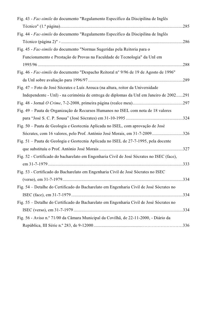 11. 11. Fig. 43 - Fac-simile do documento "Regulamento Específico da Discipilina de Inglês Técnico" (1.ª página)..............................................................................................................285 Fig. 44 - Fac-simile do documento "Regulamento Específico da Discipilina de Inglês Técnico (página 2)" - .............................................................................................................286 Fig. 45 - Fac-simile do documento "Normas Sugeridas pela Reitoria para o Funcionamento e Prestação de Provas na Faculdade de Tecnologia" da UnI em 1995/96 ..................................................................................................................................288 Fig. 46 - Fac-simile do documento "Despacho Reitoral n° 9/96 de 19 de Agosto de 1996" da UnI sobre avaliação para 1996/97 .....................................................................................289 Fig. 47 – Foto de José Sócrates e Luís Arouca (na altura, reitor da Universidade Independente - UnI) - na cerimónia de entrega de diplomas da UnI em Janeiro de 2002 ......291 Fig. 48 - Jornal O Crime, 7-2-2008, primeira página (realce meu).............................................297 Fig. 49 – Pauta de Organização de Recursos Humanos no ISEL com nota de 18 valores para ―José S. C. P. Sousa‖ (José Sócrates) em 31-10-1995 ...................................................324 Fig. 50 – Pauta de Geologia e Geotecnia Aplicada no ISEL, com aprovação de José Sócrates, com 16 valores, pelo Prof. António José Morais, em 31-7-2009............................326 Fig. 51 – Pauta de Geologia e Geotecnia Aplicada no ISEL de 27-7-1995, pela docente que substituíu o Prof. António José Morais ...........................................................................327 Fig. 52 - Certificado do bacharelato em Engenharia Civil de José Sócrates no ISEC (face), em 31-7-1979 .........................................................................................................................333 Fig. 53 - Certificado do Bacharelato em Engenharia Civil de José Sócrates no ISEC (verso), em 31-7-1979 ............................................................................................................334 Fig. 54 – Detalhe do Certificado do Bacharelato em Engenharia Civil de José Sócrates no ISEC (face), em 31-7-1979 ....................................................................................................334 Fig. 55 – Detalhe do Certificado do Bacharelato em Engenharia Civil de José Sócrates no ISEC (verso), em 31-7-1979 ..................................................................................................334 Fig. 56 - Aviso n.º 71/00 da Câmara Municipal da Covilhã, de 22-11-2000, - Diário da República, III Série n.º 283, de 9-12000 ............................................ ………………………336