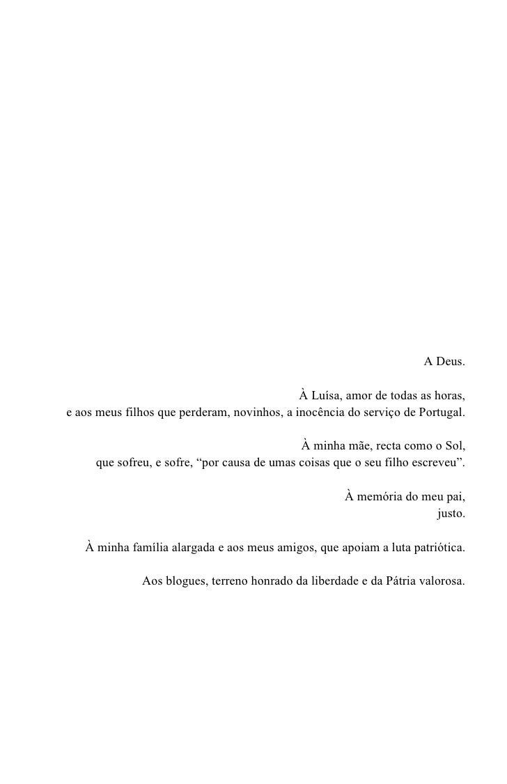13. 13. A Deus. À Luísa, amor de todas as horas, e aos meus filhos que perderam, novinhos, a inocência do serviço de Portugal. À minha mãe, recta como o Sol, que sofreu, e sofre, ―por causa de umas coisas que o seu filho escreveu‖. À memória do meu pai, justo. À minha família alargada e aos meus amigos, que apoiam a luta patriótica. Aos blogues, terreno honrado da liberdade e da Pátria valorosa.