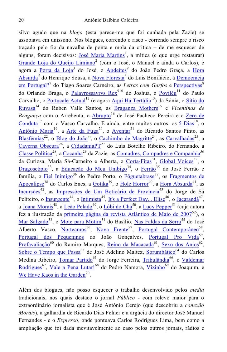 15. 15. 20 António Balbino Caldeira silvo agudo que na blogo (esta parece-me que foi cunhada pela Zazie) se assobiava em uníssono. Nos blogues, correndo o risco - correndo sempre o risco traçado pelo fio da navalha de ponta e mola da crítica – de me esquecer de alguns, foram decisivos: José Maria Martins1, a mítica (e que urge restaurar) Grande Loja do Queijo Limiano2 (com o José, o Manuel e ainda o Carlos), e agora a Porta da Loja3 do José, o Apdeites4 do João Pedro Graça, a Hora Absurda5 do Henrique Sousa, a Nova Floresta6 do Luís Bonifácio, a Democracia em Portugal?7 do Tiago Soares Carneiro, as Letras com Garfos e Perspectivas8 do Orlando Braga, o Palavrossavrvs Rex910 do Joshua, o Poviléu11 do Paulo Carvalho, o Portucale Actual12 (e agora Aqui Há Tertúlia13) da Sónia, o Sítio do Ruvasa14 do Ruben Valle Santos, as Braganza Mothers15 e Vicentinas de Bragança com o Arrebenta, o Abrupto16 de José Pacheco Pereira e o Zero de Conduta17 com o Vasco Carvalho. E ainda, entre muitos outros: os 5 Dias18, o António Maria19, a Arte da Fuga20, o Aventar21 do Ricardo Santos Pinto, as Blasfémias22, o Blog do João23, o Cachimbo de Magritte24, as Carvalhadas25, a Caverna Obscura26, a CidadaniaPT27 do Luís Botelho Ribeiro, do Fernando, a Classe Política28, a Cocanha29 da Zazie, as Comadres, Compadres e Companhia30 da Curiosa, Maria Sá-Carneiro e Alberta, o Corta-Fitas31, Global Voices32, o Dragoscópio33, a Educação do Meu Umbigo34, o Ferrão35 do José Ferrão e família, o Fiel Inimigo36 do Pedro Porto, o Fôguetabrase37, os Fragmentos de Apocalipse38 do Carlos Enes, a Gotika39, o Hole Horror40, a Hora Absurda41, as Incursões42, as Impressões de Um Boticário de Província43 do Jorge de Sá Peliteiro, o Insurgente44, o Intimista45, It's a Perfect Day... Elise46, o Jacarandá47, a Joana Morais48, a Leão Pelado49, o Lóbi do Chá50, a Lucy Pepper51 (cuja autora fez a ilustração da primeira página da revista Atlântico de Maio de 200752), o Mar Salgado53, o Mote para Motim54 do Basílio, Nas Faldas da Serra55 do José Alberto Vasco, Norteamos56, Nova Frente57, Portugal Contemporâneo58, Portugal dos Pequeninos do João Gonçalves, Portugal Pro Vida59, Profavaliação60 do Ramiro Marques, Reino da Macacada61, Sexo dos Anjos62, Sobre o Tempo que Passa63 de José Adelino Maltez, Sorumbático64 do Carlos Medina Ribeiro, Tomar Partido65 do Jorge Ferreira, Tribulândia66, o Valdemar Rodrigues67, Vale a Pena Lutar!68 do Pedro Namora, Vizinho69 do Joaquim, e We Have Kaos in the Garden70. Além dos blogues, não posso esquecer o trabalho desenvolvido pelos media tradicionais, nos quais destaco o jornal Público - com relevo maior para o extraordinário jornalista que é José António Cerejo (que descobriu a conexão Morais), a galhardia de Ricardo Dias Felner e a argúcia do director José Manuel Fernandes - e o Expresso, onde pontuava Carlos Rodrigues Lima, bem como a ampliação que foi dada inevitavelmente ao caso pelos outros jornais, rádios e