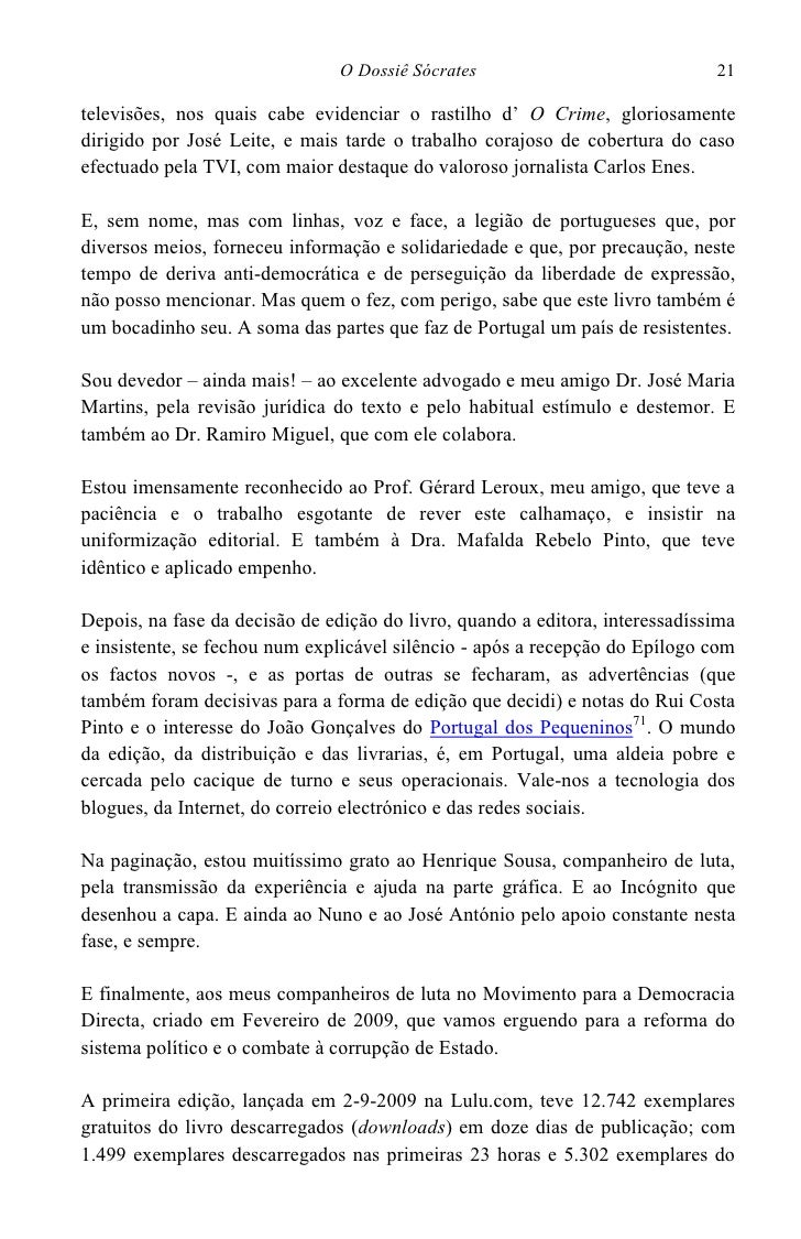 16. 16. O Dossiê Sócrates 21 televisões, nos quais cabe evidenciar o rastilho d‘ O Crime, gloriosamente dirigido por José Leite, e mais tarde o trabalho corajoso de cobertura do caso efectuado pela TVI, com maior destaque do valoroso jornalista Carlos Enes. E, sem nome, mas com linhas, voz e face, a legião de portugueses que, por diversos meios, forneceu informação e solidariedade e que, por precaução, neste tempo de deriva anti-democrática e de perseguição da liberdade de expressão, não posso mencionar. Mas quem o fez, com perigo, sabe que este livro também é um bocadinho seu. A soma das partes que faz de Portugal um país de resistentes. Sou devedor – ainda mais! – ao excelente advogado e meu amigo Dr. José Maria Martins, pela revisão jurídica do texto e pelo habitual estímulo e destemor. E também ao Dr. Ramiro Miguel, que com ele colabora. Estou imensamente reconhecido ao Prof. Gérard Leroux, meu amigo, que teve a paciência e o trabalho esgotante de rever este calhamaço, e insistir na uniformização editorial. E também à Dra. Mafalda Rebelo Pinto, que teve idêntico e aplicado empenho. Depois, na fase da decisão de edição do livro, quando a editora, interessadíssima e insistente, se fechou num explicável silêncio - após a recepção do Epílogo com os factos novos -, e as portas de outras se fecharam, as advertências (que também foram decisivas para a forma de edição que decidi) e notas do Rui Costa Pinto e o interesse do João Gonçalves do Portugal dos Pequeninos71. O mundo da edição, da distribuição e das livrarias, é, em Portugal, uma aldeia pobre e cercada pelo cacique de turno e seus operacionais. Vale-nos a tecnologia dos blogues, da Internet, do correio electrónico e das redes sociais. Na paginação, estou muitíssimo grato ao Henrique Sousa, companheiro de luta, pela transmissão da experiência e ajuda na parte gráfica. E ao Incógnito que desenhou a capa. E ainda ao Nuno e ao José António pelo apoio constante nesta fase, e sempre. E finalmente, aos meus companheiros de luta no Movimento para a Democracia Directa, criado em Fevereiro de 2009, que vamos erguendo para a reforma do sistema político e o combate à corrupção de Estado. A primeira edição, lançada em 2-9-2009 na Lulu.com, teve 12.742 exemplares gratuitos do livro descarregados (downloads) em doze dias de publicação; com 1.499 exemplares descarregados nas primeiras 23 horas e 5.302 exemplares do