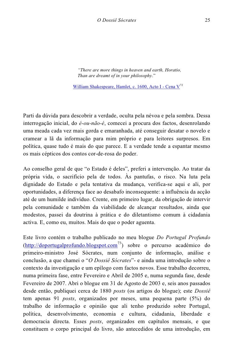 20. 20. O Dossiê Sócrates 25 “There are more things in heaven and earth, Horatio, Than are dreamt of in your philosophy.‖ William Shakespeare, Hamlet, c. 1600, Acto I - Cena V72 Parti da dúvida para descobrir a verdade, oculta pela névoa e pela sombra. Dessa interrogação inicial, do é-ou-não-é, comecei a procura dos factos, desenrolando uma meada cada vez mais gorda e emaranhada, até conseguir desatar o novelo e cramear a lã da informação para mim próprio e para leitores surpresos. Em política, quase tudo é mais do que parece. E a verdade tende a espantar mesmo os mais cépticos dos contos cor-de-rosa do poder. Ao conselho geral de que ―o Estado é deles‖, preferi a intervenção. Ao tratar da própria vida, o sacrifício pela de todos. Às pantufas, o risco. Na luta pela dignidade do Estado e pela tentativa da mudança, verifica-se aqui e ali, por oportunidades, a diferença face ao desabafo inconsequente: a influência da acção até de um humilde indivíduo. Crente, em primeiro lugar, da obrigação de intervir pela comunidade e também da viabilidade de alcançar resultados, ainda que modestos, passei da doutrina à prática e do diletantismo comum à cidadania activa. E, como eu, muitos. Mais do que o poder aguenta. Este livro contém o trabalho publicado no meu blogue Do Portugal Profundo (http://doportugalprofundo.blogspot.com73) sobre o percurso académico do primeiro-ministro José Sócrates, num conjunto de informação, análise e conclusão, a que chamei o ―O Dossiê Sócrates‖- e ainda uma introdução sobre o contexto da investigação e um epílogo com factos novos. Esse trabalho decorreu, numa primeira fase, entre Fevereiro e Abril de 2005 e, numa segunda fase, desde Fevereiro de 2007. Abri o blogue em 31 de Agosto de 2003 e, seis anos passados desde então, publiquei cerca de 1880 posts (os artigos do blogue); este Dossiê tem apenas 91 posts, organizados por meses, uma pequena parte (5%) do trabalho de informação e opinião que ali tenho produzido sobre Portugal, política, desenvolvimento, economia e cultura, cidadania, liberdade e democracia directa. Esses posts, organizados em capítulos mensais, e que constituem o corpo principal do livro, são antecedidos de uma introdução, em