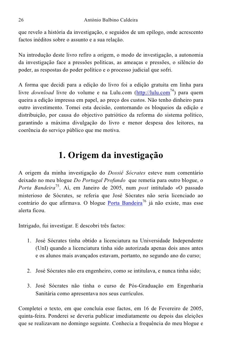 21. 21. 26 António Balbino Caldeira que revelo a história da investigação, e seguidos de um epílogo, onde acrescento factos inéditos sobre o assunto e a sua relação. Na introdução deste livro refiro a origem, o modo de investigação, a autonomia da investigação face a pressões políticas, as ameaças e pressões, o silêncio do poder, as respostas do poder político e o processo judicial que sofri. A forma que decidi para a edição do livro foi a edição gratuita em linha para livre download livre do volume e na Lulu.com (http://lulu.com74) para quem queira a edição impressa em papel, ao preço dos custos. Não tenho dinheiro para outro investimento. Tomei esta decisão, contornando os bloqueios da edição e distribuição, por causa do objectivo patriótico da reforma do sistema político, garantindo a máxima divulgação do livro e menor despesa dos leitores, na coerência do serviço público que me motiva. 1. Origem da investigação A origem da minha investigação do Dossiê Sócrates esteve num comentário deixado no meu blogue Do Portugal Profundo que remetia para outro blogue, o Porta Bandeira75. Aí, em Janeiro de 2005, num post intitulado «O passado misterioso de Sócrates, se referia que José Sócrates não seria licenciado ao contrário do que afirmava. O blogue Porta Bandeira76 já não existe, mas esse alerta ficou. Intrigado, fui investigar. E descobri três factos: 1. José Sócrates tinha obtido a licenciatura na Universidade Independente (UnI) quando a licenciatura tinha sido autorizada apenas dois anos antes e os alunos mais avançados estavam, portanto, no segundo ano do curso; 2. José Sócrates não era engenheiro, como se intitulava, e nunca tinha sido; 3. José Sócrates não tinha o curso de Pós-Graduação em Engenharia Sanitária como apresentava nos seus currículos. Completei o texto, em que concluía esse factos, em 16 de Fevereiro de 2005, quinta-feira. Ponderei se deveria publicar imediatamente ou depois das eleições que se realizavam no domingo seguinte. Conhecia a frequência do meu blogue e