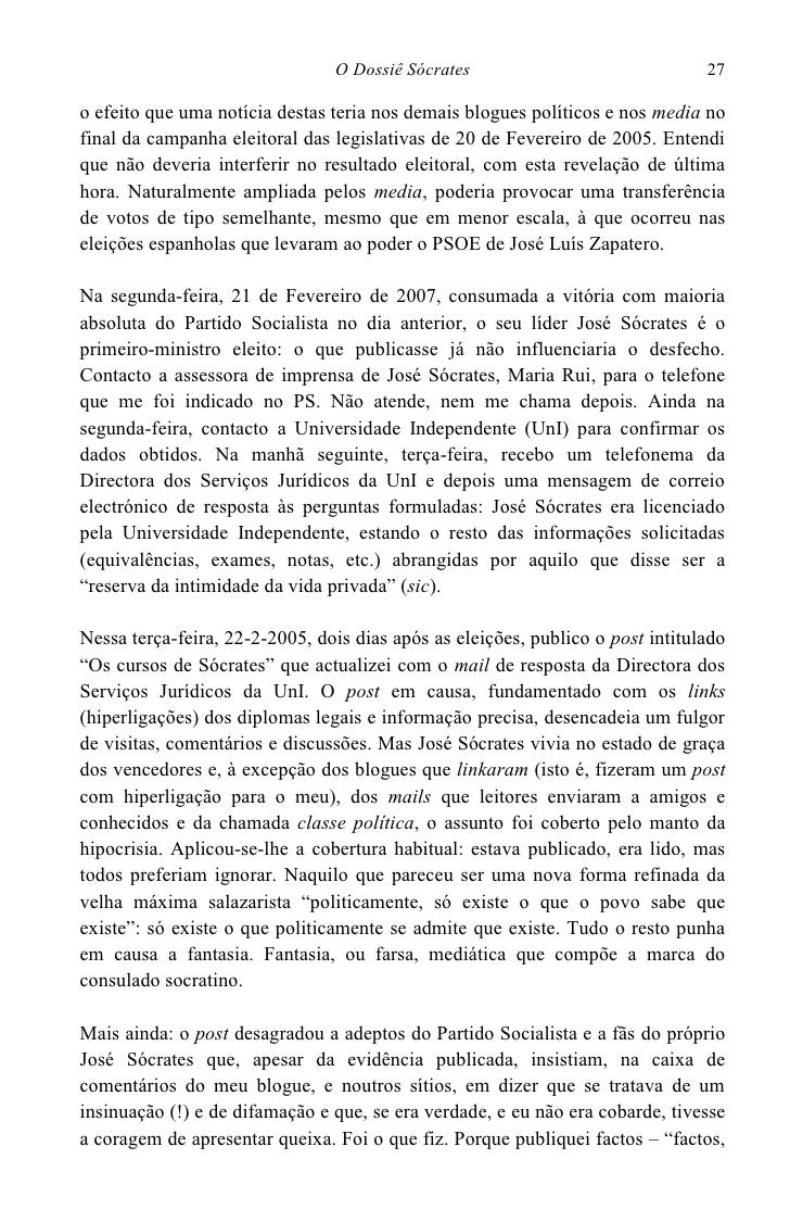 22. 22. O Dossiê Sócrates 27 o efeito que uma notícia destas teria nos demais blogues políticos e nos media no final da campanha eleitoral das legislativas de 20 de Fevereiro de 2005. Entendi que não deveria interferir no resultado eleitoral, com esta revelação de última hora. Naturalmente ampliada pelos media, poderia provocar uma transferência de votos de tipo semelhante, mesmo que em menor escala, à que ocorreu nas eleições espanholas que levaram ao poder o PSOE de José Luís Zapatero. Na segunda-feira, 21 de Fevereiro de 2007, consumada a vitória com maioria absoluta do Partido Socialista no dia anterior, o seu líder José Sócrates é o primeiro-ministro eleito: o que publicasse já não influenciaria o desfecho. Contacto a assessora de imprensa de José Sócrates, Maria Rui, para o telefone que me foi indicado no PS. Não atende, nem me chama depois. Ainda na segunda-feira, contacto a Universidade Independente (UnI) para confirmar os dados obtidos. Na manhã seguinte, terça-feira, recebo um telefonema da Directora dos Serviços Jurídicos da UnI e depois uma mensagem de correio electrónico de resposta às perguntas formuladas: José Sócrates era licenciado pela Universidade Independente, estando o resto das informações solicitadas (equivalências, exames, notas, etc.) abrangidas por aquilo que disse ser a ―reserva da intimidade da vida privada‖ (sic). Nessa terça-feira, 22-2-2005, dois dias após as eleições, publico o post intitulado ―Os cursos de Sócrates‖ que actualizei com o mail de resposta da Directora dos Serviços Jurídicos da UnI. O post em causa, fundamentado com os links (hiperligações) dos diplomas legais e informação precisa, desencadeia um fulgor de visitas, comentários e discussões. Mas José Sócrates vivia no estado de graça dos vencedores e, à excepção dos blogues que linkaram (isto é, fizeram um post com hiperligação para o meu), dos mails que leitores enviaram a amigos e conhecidos e da chamada classe política, o assunto foi coberto pelo manto da hipocrisia. Aplicou-se-lhe a cobertura habitual: estava publicado, era lido, mas todos preferiam ignorar. Naquilo que pareceu ser uma nova forma refinada da velha máxima salazarista ―politicamente, só existe o que o povo sabe que existe‖: só existe o que politicamente se admite que existe. Tudo o resto punha em causa a fantasia. Fantasia, ou farsa, mediática que compõe a marca do consulado socratino. Mais ainda: o post desagradou a adeptos do Partido Socialista e a fãs do próprio José Sócrates que, apesar da evidência publicada, insistiam, na caixa de comentários do meu blogue, e noutros sítios, em dizer que se tratava de um insinuação (!) e de difamação e que, se era verdade, e eu não era cobarde, tivesse a coragem de apresentar queixa. Foi o que fiz. Porque publiquei factos – ―factos,