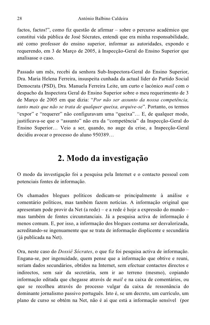 23. 23. 28 António Balbino Caldeira factos, factos!‖, como fiz questão de afirmar – sobre o percurso académico que constitui vida pública de José Sócrates, entendi que era minha responsabilidade, até como professor do ensino superior, informar as autoridades, expondo e requerendo, em 3 de Março de 2005, à Inspecção-Geral do Ensino Superior que analisasse o caso. Passado um mês, recebi da senhora Sub-Inspectora-Geral do Ensino Superior, Dra. Maria Helena Ferreira, insuspeita cunhada da actual líder do Partido Social Democrata (PSD), Dra. Manuela Ferreira Leite, um curto e lacónico mail com o despacho da Inspectora Geral do Ensino Superior sobre o meu requerimento de 3 de Março de 2005 em que dizia: ―Por não ser assunto da nossa competência, tanto mais que não se trata de qualquer queixa, arquive-se‖. Portanto, os termos ―expor‖ e ―requerer‖ não configuravam uma ―queixa‖… E, de qualquer modo, justificava-se que o ―assunto‖ não era da ―competência‖ da Inspecção-Geral do Ensino Superior… Veio a ser, quando, no auge da crise, a Inspecção-Geral decidiu avocar o processo do aluno 950389… 2. Modo da investigação O modo da investigação foi a pesquisa pela Internet e o contacto pessoal com potenciais fontes de informação. Os chamados blogues políticos dedicam-se principalmente à análise e comentário políticos, mas também fazem notícias. A informação original que apresentam pode provir da Net (a rede) – e a rede é hoje a expressão do mundo – mas também de fontes circunstanciais. Já a pesquisa activa de informação é menos comum. E, por isso, a informação dos blogues costuma ser desvalorizada, acreditando-se ingenuamente que se trata de informação displicente e secundária (já publicada na Net). Ora, neste caso do Dossiê Sócrates, o que fiz foi pesquisa activa de informação. Engana-se, por ingenuidade, quem pense que a informação que obtive e reuni, seriam dados secundários, obtidos na Internet, sem efectuar contactos directos e indirectos, sem sair da secretária, sem ir ao terreno (mesmo), copiando informação editada que chegasse através de mail e na caixa de comentários, ou que se recolheu através do processo vulgar da caixa de ressonância do dominante jornalismo passivo português. Isto é, se um decreto, um currículo, um plano de curso se obtém na Net, não é aí que está a informação sensível (por
