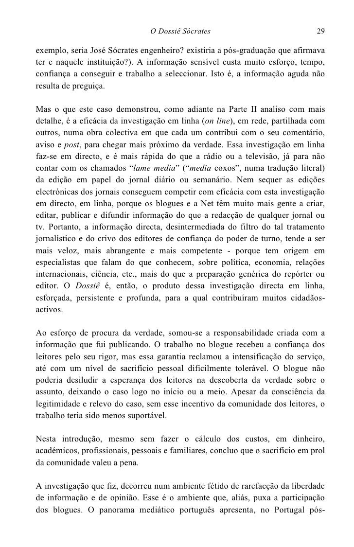24. 24. O Dossiê Sócrates 29 exemplo, seria José Sócrates engenheiro? existiria a pós-graduação que afirmava ter e naquele instituição?). A informação sensível custa muito esforço, tempo, confiança a conseguir e trabalho a seleccionar. Isto é, a informação aguda não resulta de preguiça. Mas o que este caso demonstrou, como adiante na Parte II analiso com mais detalhe, é a eficácia da investigação em linha (on line), em rede, partilhada com outros, numa obra colectiva em que cada um contribui com o seu comentário, aviso e post, para chegar mais próximo da verdade. Essa investigação em linha faz-se em directo, e é mais rápida do que a rádio ou a televisão, já para não contar com os chamados ―lame media‖ (―media coxos‖, numa tradução literal) da edição em papel do jornal diário ou semanário. Nem sequer as edições electrónicas dos jornais conseguem competir com eficácia com esta investigação em directo, em linha, porque os blogues e a Net têm muito mais gente a criar, editar, publicar e difundir informação do que a redacção de qualquer jornal ou tv. Portanto, a informação directa, desintermediada do filtro do tal tratamento jornalístico e do crivo dos editores de confiança do poder de turno, tende a ser mais veloz, mais abrangente e mais competente - porque tem origem em especialistas que falam do que conhecem, sobre política, economia, relações internacionais, ciência, etc., mais do que a preparação genérica do repórter ou editor. O Dossiê é, então, o produto dessa investigação directa em linha, esforçada, persistente e profunda, para a qual contribuíram muitos cidadãos- activos. Ao esforço de procura da verdade, somou-se a responsabilidade criada com a informação que fui publicando. O trabalho no blogue recebeu a confiança dos leitores pelo seu rigor, mas essa garantia reclamou a intensificação do serviço, até com um nível de sacrifício pessoal dificilmente tolerável. O blogue não poderia desiludir a esperança dos leitores na descoberta da verdade sobre o assunto, deixando o caso logo no início ou a meio. Apesar da consciência da legitimidade e relevo do caso, sem esse incentivo da comunidade dos leitores, o trabalho teria sido menos suportável. Nesta introdução, mesmo sem fazer o cálculo dos custos, em dinheiro, académicos, profissionais, pessoais e familiares, concluo que o sacrifício em prol da comunidade valeu a pena. A investigação que fiz, decorreu num ambiente fétido de rarefacção da liberdade de informação e de opinião. Esse é o ambiente que, aliás, puxa a participação dos blogues. O panorama mediático português apresenta, no Portugal pós-