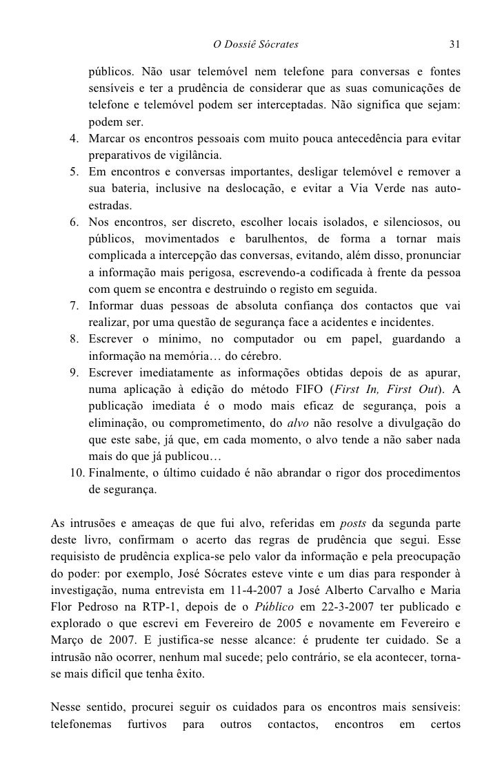 26. 26. O Dossiê Sócrates 31 públicos. Não usar telemóvel nem telefone para conversas e fontes sensíveis e ter a prudência de considerar que as suas comunicações de telefone e telemóvel podem ser interceptadas. Não significa que sejam: podem ser. 4. Marcar os encontros pessoais com muito pouca antecedência para evitar preparativos de vigilância. 5. Em encontros e conversas importantes, desligar telemóvel e remover a sua bateria, inclusive na deslocação, e evitar a Via Verde nas auto- estradas. 6. Nos encontros, ser discreto, escolher locais isolados, e silenciosos, ou públicos, movimentados e barulhentos, de forma a tornar mais complicada a intercepção das conversas, evitando, além disso, pronunciar a informação mais perigosa, escrevendo-a codificada à frente da pessoa com quem se encontra e destruindo o registo em seguida. 7. Informar duas pessoas de absoluta confiança dos contactos que vai realizar, por uma questão de segurança face a acidentes e incidentes. 8. Escrever o mínimo, no computador ou em papel, guardando a informação na memória… do cérebro. 9. Escrever imediatamente as informações obtidas depois de as apurar, numa aplicação à edição do método FIFO (First In, First Out). A publicação imediata é o modo mais eficaz de segurança, pois a eliminação, ou comprometimento, do alvo não resolve a divulgação do que este sabe, já que, em cada momento, o alvo tende a não saber nada mais do que já publicou… 10. Finalmente, o último cuidado é não abrandar o rigor dos procedimentos de segurança. As intrusões e ameaças de que fui alvo, referidas em posts da segunda parte deste livro, confirmam o acerto das regras de prudência que segui. Esse requisisto de prudência explica-se pelo valor da informação e pela preocupação do poder: por exemplo, José Sócrates esteve vinte e um dias para responder à investigação, numa entrevista em 11-4-2007 a José Alberto Carvalho e Maria Flor Pedroso na RTP-1, depois de o Público em 22-3-2007 ter publicado e explorado o que escrevi em Fevereiro de 2005 e novamente em Fevereiro e Março de 2007. E justifica-se nesse alcance: é prudente ter cuidado. Se a intrusão não ocorrer, nenhum mal sucede; pelo contrário, se ela acontecer, torna- se mais difícil que tenha êxito. Nesse sentido, procurei seguir os cuidados para os encontros mais sensíveis: telefonemas furtivos para outros contactos, encontros em certos