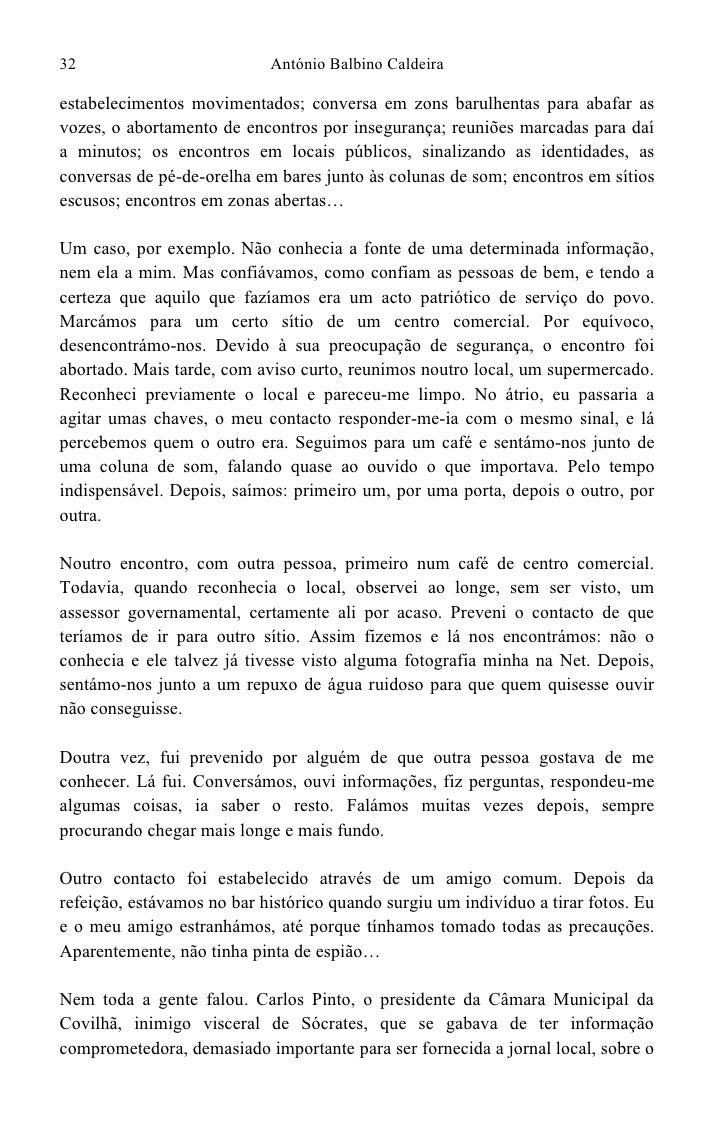 27. 27. 32 António Balbino Caldeira estabelecimentos movimentados; conversa em zons barulhentas para abafar as vozes, o abortamento de encontros por insegurança; reuniões marcadas para daí a minutos; os encontros em locais públicos, sinalizando as identidades, as conversas de pé-de-orelha em bares junto às colunas de som; encontros em sítios escusos; encontros em zonas abertas… Um caso, por exemplo. Não conhecia a fonte de uma determinada informação, nem ela a mim. Mas confiávamos, como confiam as pessoas de bem, e tendo a certeza que aquilo que fazíamos era um acto patriótico de serviço do povo. Marcámos para um certo sítio de um centro comercial. Por equívoco, desencontrámo-nos. Devido à sua preocupação de segurança, o encontro foi abortado. Mais tarde, com aviso curto, reunimos noutro local, um supermercado. Reconheci previamente o local e pareceu-me limpo. No átrio, eu passaria a agitar umas chaves, o meu contacto responder-me-ia com o mesmo sinal, e lá percebemos quem o outro era. Seguimos para um café e sentámo-nos junto de uma coluna de som, falando quase ao ouvido o que importava. Pelo tempo indispensável. Depois, saímos: primeiro um, por uma porta, depois o outro, por outra. Noutro encontro, com outra pessoa, primeiro num café de centro comercial. Todavia, quando reconhecia o local, observei ao longe, sem ser visto, um assessor governamental, certamente ali por acaso. Preveni o contacto de que teríamos de ir para outro sítio. Assim fizemos e lá nos encontrámos: não o conhecia e ele talvez já tivesse visto alguma fotografia minha na Net. Depois, sentámo-nos junto a um repuxo de água ruidoso para que quem quisesse ouvir não conseguisse. Doutra vez, fui prevenido por alguém de que outra pessoa gostava de me conhecer. Lá fui. Conversámos, ouvi informações, fiz perguntas, respondeu-me algumas coisas, ia saber o resto. Falámos muitas vezes depois, sempre procurando chegar mais longe e mais fundo. Outro contacto foi estabelecido através de um amigo comum. Depois da refeição, estávamos no bar histórico quando surgiu um indivíduo a tirar fotos. Eu e o meu amigo estranhámos, até porque tínhamos tomado todas as precauções. Aparentemente, não tinha pinta de espião… Nem toda a gente falou. Carlos Pinto, o presidente da Câmara Municipal da Covilhã, inimigo visceral de Sócrates, que se gabava de ter informação comprometedora, demasiado importante para ser fornecida a jornal local, sobre o