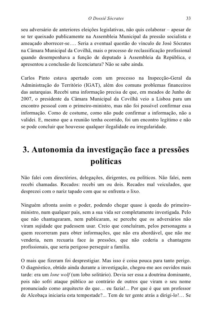 28. 28. O Dossiê Sócrates 33 seu adversário de anteriores eleições legislativas, não quis colaborar – apesar de se ter queixado publicamente na Assembleia Municipal da pressão socialista e ameaçado aborrecer-se…. Seria a eventual questão do vínculo de José Sócrates na Câmara Municipal da Covilhã, mais o processo de reclassificação profissional quando desempenhava a função de deputado à Assembleia da República, e apresentou a conclusão de licenciatura? Não se sabe ainda. Carlos Pinto estava apertado com um processo na Inspecção-Geral da Administração do Território (IGAT), além dos comuns problemas financeiros das autarquias. Recebi uma informação precisa de que, em meados de Junho de 2007, o presidente da Câmara Municipal da Covilhã veio a Lisboa para um encontro pessoal com o primeiro-ministro, mas não foi possível confirmar essa informação. Como de costume, como não pude confirmar a informação, não a validei. E, mesmo que a reunião tenha ocorrido, foi um encontro legítimo e não se pode concluir que houvesse qualquer ilegalidade ou irregularidade. 3. Autonomia da investigação face a pressões políticas Não falei com directórios, delegações, dirigentes, ou políticos. Não falei, nem recebi chamadas. Recados: recebi um ou dois. Recados mal veiculados, que desprezei com o nariz tapado com que se enfrenta o lixo. Ninguém afronta assim o poder, podendo chegar quase à queda do primeiro- ministro, num qualquer país, sem a sua vida ser completamente investigada. Pelo que não chantagearam, nem publicaram, se percebe que os adversários não viram sujidade que pudessem usar. Creio que concluíram, pelos personagens a quem recorreram para obter informações, que não era abordável, que não me venderia, nem recuaria face às pressões, que não cederia a chantagens profissionais, que seria perigoso perseguir a família. O mais que fizeram foi desprestigiar. Mas isso é coisa pouca para tanto perigo. O diagnóstico, obtido ainda durante a investigação, chegou-me aos ouvidos mais tarde: era um lone wolf (um lobo solitário). Devia ser essa a doutrina dominante, pois não sofri ataque público ao contrário de outros que viram o seu nome pronunciado como arquitecto do que… eu fazia!... Por que é que um professor de Alcobaça iniciaria esta tempestade?... Tem de ter gente atrás a dirigi-lo!… Se