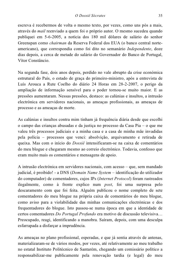 30. 30. O Dossiê Sócrates 35 escreva é recebermos de volta o mesmo texto, por vezes, como uns pós a mais, através do mail reenviado a quem foi o próprio autor. O mesmo sucedeu quando publiquei em 5-6-2005, a notícia dos 180 mil dólares de salário do senhor Greenspan como chairman da Reserva Federal dos EUA (o banco central norte- americano), que correspondia como foi dito no semanário Independente, doze dias depois, a cerca de metade do salário do Governador do Banco de Portugal, Vítor Constâncio. Na segunda fase, dois anos depois, perdido no vale abrupto da crise económica estrutural do País, o estado de graça do primeiro-ministro, após a entrevista de Luís Arouca a Rute Coelho do diário 24 Horas em 28-2-2007, o perigo da ampliação de informação sensível para o poder tornou-se muito maior. E as pressões aumentaram. Nessas pressões, destaco: as calúnias e insultos, a intrusão electrónica em servidores nacionais, as ameaças profissionais, as ameaças de processo e as ameaças de morte. As calúnias e insultos contra mim tinham já frequência diária desde que escolhi o campo das crianças abusadas e da justiça no processo da Casa Pia – o que me valeu três processos judiciais e a minha casa e a casa de minha mãe invadidas pela polícia – processos que venci: absolvição, arquivamento e retirada de queixa. Mas com o início do Dossiê intensificaram-se na caixa de comentários do meu blogue e chegaram mesmo ao correio electrónico. Todavia, confesso que eram muito mais os comentários e mensagens de apoio. A intrusão electrónica em servidores nacionais, com acesso – que, sem mandado judicial, é proibido! - a DNS (Domain Name System – identificação do utilizador do computador) de comentadores, cujos IPs (Internet Protocol) foram rastreados ilegalmente, como à frente explico num post, foi uma surpresa pelo descaramento com que foi feita. Alguém publicou o nome completo de sete comentadores do meu blogue na própria caixa de comentários do meu blogue, como aviso para a violabilidade das minhas comunicações electrónicas e dos frequentadores do blogue. Isto passou-se numa época em que a identidade de certos comentadores Do Portugal Profundo era motivo de discussão televisiva… Preocupado, reagi, identificando a manobra. Saíram, depois, com uma desculpa esfarrapada a disfarçar a imprudência. As ameaças no plano profissional, esperadas, e que já sentia através de antenas, materializaram-se de vários modos, por vezes, até relativamente ao meu trabalho no estatal Instituto Politécnico de Santarém, chegando um comissário político a responsabilizar-me publicamente pela renovação tardia (e legal) do meu