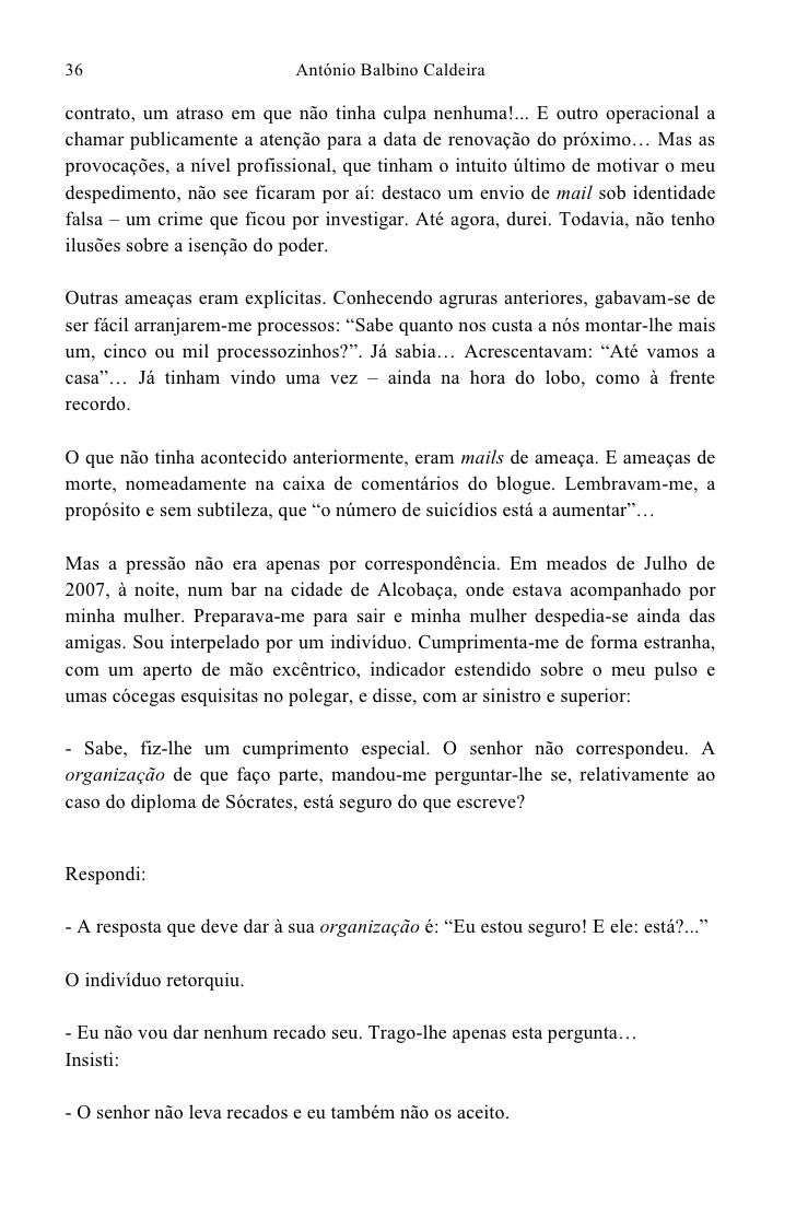 31. 31. 36 António Balbino Caldeira contrato, um atraso em que não tinha culpa nenhuma!... E outro operacional a chamar publicamente a atenção para a data de renovação do próximo… Mas as provocações, a nível profissional, que tinham o intuito último de motivar o meu despedimento, não see ficaram por aí: destaco um envio de mail sob identidade falsa – um crime que ficou por investigar. Até agora, durei. Todavia, não tenho ilusões sobre a isenção do poder. Outras ameaças eram explícitas. Conhecendo agruras anteriores, gabavam-se de ser fácil arranjarem-me processos: ―Sabe quanto nos custa a nós montar-lhe mais um, cinco ou mil processozinhos?‖. Já sabia… Acrescentavam: ―Até vamos a casa‖… Já tinham vindo uma vez – ainda na hora do lobo, como à frente recordo. O que não tinha acontecido anteriormente, eram mails de ameaça. E ameaças de morte, nomeadamente na caixa de comentários do blogue. Lembravam-me, a propósito e sem subtileza, que ―o número de suicídios está a aumentar‖… Mas a pressão não era apenas por correspondência. Em meados de Julho de 2007, à noite, num bar na cidade de Alcobaça, onde estava acompanhado por minha mulher. Preparava-me para sair e minha mulher despedia-se ainda das amigas. Sou interpelado por um indivíduo. Cumprimenta-me de forma estranha, com um aperto de mão excêntrico, indicador estendido sobre o meu pulso e umas cócegas esquisitas no polegar, e disse, com ar sinistro e superior: - Sabe, fiz-lhe um cumprimento especial. O senhor não correspondeu. A organização de que faço parte, mandou-me perguntar-lhe se, relativamente ao caso do diploma de Sócrates, está seguro do que escreve? Respondi: - A resposta que deve dar à sua organização é: ―Eu estou seguro! E ele: está?...‖ O indivíduo retorquiu. - Eu não vou dar nenhum recado seu. Trago-lhe apenas esta pergunta… Insisti: - O senhor não leva recados e eu também não os aceito.