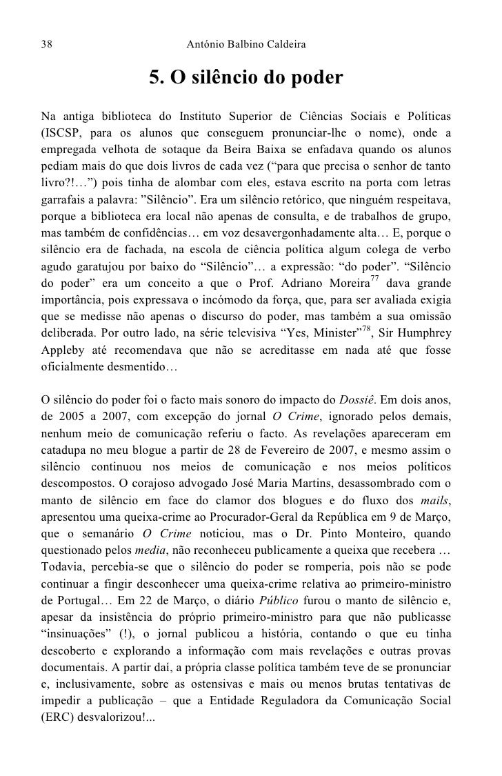 33. 33. 38 António Balbino Caldeira 5. O silêncio do poder Na antiga biblioteca do Instituto Superior de Ciências Sociais e Políticas (ISCSP, para os alunos que conseguem pronunciar-lhe o nome), onde a empregada velhota de sotaque da Beira Baixa se enfadava quando os alunos pediam mais do que dois livros de cada vez (―para que precisa o senhor de tanto livro?!…‖) pois tinha de alombar com eles, estava escrito na porta com letras garrafais a palavra: ‖Silêncio‖. Era um silêncio retórico, que ninguém respeitava, porque a biblioteca era local não apenas de consulta, e de trabalhos de grupo, mas também de confidências… em voz desavergonhadamente alta… E, porque o silêncio era de fachada, na escola de ciência política algum colega de verbo agudo garatujou por baixo do ―Silêncio‖… a expressão: ―do poder‖. ―Silêncio do poder‖ era um conceito a que o Prof. Adriano Moreira 77 dava grande importância, pois expressava o incómodo da força, que, para ser avaliada exigia que se medisse não apenas o discurso do poder, mas também a sua omissão deliberada. Por outro lado, na série televisiva ―Yes, Minister‖78, Sir Humphrey Appleby até recomendava que não se acreditasse em nada até que fosse oficialmente desmentido… O silêncio do poder foi o facto mais sonoro do impacto do Dossiê. Em dois anos, de 2005 a 2007, com excepção do jornal O Crime, ignorado pelos demais, nenhum meio de comunicação referiu o facto. As revelações apareceram em catadupa no meu blogue a partir de 28 de Fevereiro de 2007, e mesmo assim o silêncio continuou nos meios de comunicação e nos meios políticos descompostos. O corajoso advogado José Maria Martins, desassombrado com o manto de silêncio em face do clamor dos blogues e do fluxo dos mails, apresentou uma queixa-crime ao Procurador-Geral da República em 9 de Março, que o semanário O Crime noticiou, mas o Dr. Pinto Monteiro, quando questionado pelos media, não reconheceu publicamente a queixa que recebera … Todavia, percebia-se que o silêncio do poder se romperia, pois não se pode continuar a fingir desconhecer uma queixa-crime relativa ao primeiro-ministro de Portugal… Em 22 de Março, o diário Público furou o manto de silêncio e, apesar da insistência do próprio primeiro-ministro para que não publicasse ―insinuações‖ (!), o jornal publicou a história, contando o que eu tinha descoberto e explorando a informação com mais revelações e outras provas documentais. A partir daí, a própria classe política também teve de se pronunciar e, inclusivamente, sobre as ostensivas e mais ou menos brutas tentativas de impedir a publicação – que a Entidade Reguladora da Comunicação Social (ERC) desvalorizou!...