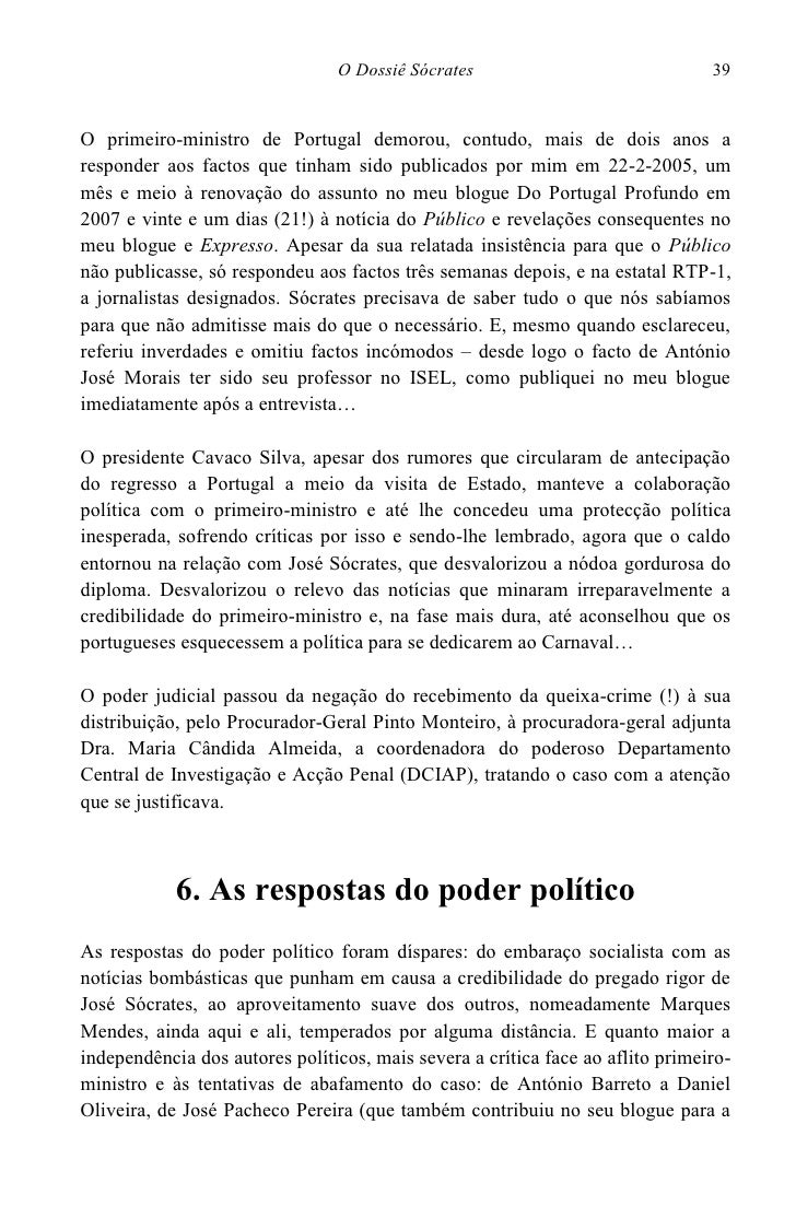 34. 34. O Dossiê Sócrates 39 O primeiro-ministro de Portugal demorou, contudo, mais de dois anos a responder aos factos que tinham sido publicados por mim em 22-2-2005, um mês e meio à renovação do assunto no meu blogue Do Portugal Profundo em 2007 e vinte e um dias (21!) à notícia do Público e revelações consequentes no meu blogue e Expresso. Apesar da sua relatada insistência para que o Público não publicasse, só respondeu aos factos três semanas depois, e na estatal RTP-1, a jornalistas designados. Sócrates precisava de saber tudo o que nós sabíamos para que não admitisse mais do que o necessário. E, mesmo quando esclareceu, referiu inverdades e omitiu factos incómodos – desde logo o facto de António José Morais ter sido seu professor no ISEL, como publiquei no meu blogue imediatamente após a entrevista… O presidente Cavaco Silva, apesar dos rumores que circularam de antecipação do regresso a Portugal a meio da visita de Estado, manteve a colaboração política com o primeiro-ministro e até lhe concedeu uma protecção política inesperada, sofrendo críticas por isso e sendo-lhe lembrado, agora que o caldo entornou na relação com José Sócrates, que desvalorizou a nódoa gordurosa do diploma. Desvalorizou o relevo das notícias que minaram irreparavelmente a credibilidade do primeiro-ministro e, na fase mais dura, até aconselhou que os portugueses esquecessem a política para se dedicarem ao Carnaval… O poder judicial passou da negação do recebimento da queixa-crime (!) à sua distribuição, pelo Procurador-Geral Pinto Monteiro, à procuradora-geral adjunta Dra. Maria Cândida Almeida, a coordenadora do poderoso Departamento Central de Investigação e Acção Penal (DCIAP), tratando o caso com a atenção que se justificava. 6. As respostas do poder político As respostas do poder político foram díspares: do embaraço socialista com as notícias bombásticas que punham em causa a credibilidade do pregado rigor de José Sócrates, ao aproveitamento suave dos outros, nomeadamente Marques Mendes, ainda aqui e ali, temperados por alguma distância. E quanto maior a independência dos autores políticos, mais severa a crítica face ao aflito primeiro- ministro e às tentativas de abafamento do caso: de António Barreto a Daniel Oliveira, de José Pacheco Pereira (que também contribuiu no seu blogue para a