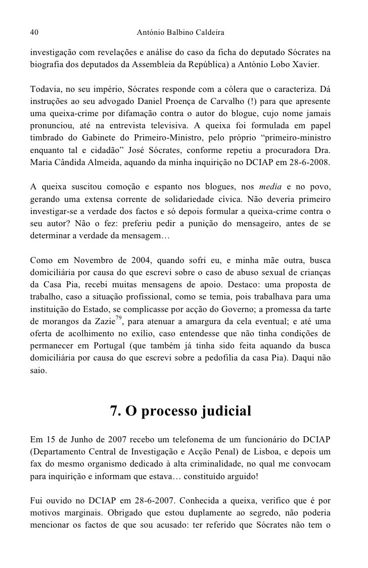 35. 35. 40 António Balbino Caldeira investigação com revelações e análise do caso da ficha do deputado Sócrates na biografia dos deputados da Assembleia da República) a António Lobo Xavier. Todavia, no seu império, Sócrates responde com a cólera que o caracteriza. Dá instruções ao seu advogado Daniel Proença de Carvalho (!) para que apresente uma queixa-crime por difamação contra o autor do blogue, cujo nome jamais pronunciou, até na entrevista televisiva. A queixa foi formulada em papel timbrado do Gabinete do Primeiro-Ministro, pelo próprio ―primeiro-ministro enquanto tal e cidadão‖ José Sócrates, conforme repetiu a procuradora Dra. Maria Cândida Almeida, aquando da minha inquirição no DCIAP em 28-6-2008. A queixa suscitou comoção e espanto nos blogues, nos media e no povo, gerando uma extensa corrente de solidariedade cívica. Não deveria primeiro investigar-se a verdade dos factos e só depois formular a queixa-crime contra o seu autor? Não o fez: preferiu pedir a punição do mensageiro, antes de se determinar a verdade da mensagem… Como em Novembro de 2004, quando sofri eu, e minha mãe outra, busca domiciliária por causa do que escrevi sobre o caso de abuso sexual de crianças da Casa Pia, recebi muitas mensagens de apoio. Destaco: uma proposta de trabalho, caso a situação profissional, como se temia, pois trabalhava para uma instituição do Estado, se complicasse por acção do Governo; a promessa da tarte de morangos da Zazie79, para atenuar a amargura da cela eventual; e até uma oferta de acolhimento no exílio, caso entendesse que não tinha condições de permanecer em Portugal (que também já tinha sido feita aquando da busca domiciliária por causa do que escrevi sobre a pedofilia da casa Pia). Daqui não saio. 7. O processo judicial Em 15 de Junho de 2007 recebo um telefonema de um funcionário do DCIAP (Departamento Central de Investigação e Acção Penal) de Lisboa, e depois um fax do mesmo organismo dedicado à alta criminalidade, no qual me convocam para inquirição e informam que estava… constituído arguido! Fui ouvido no DCIAP em 28-6-2007. Conhecida a queixa, verifico que é por motivos marginais. Obrigado que estou duplamente ao segredo, não poderia mencionar os factos de que sou acusado: ter referido que Sócrates não tem o
