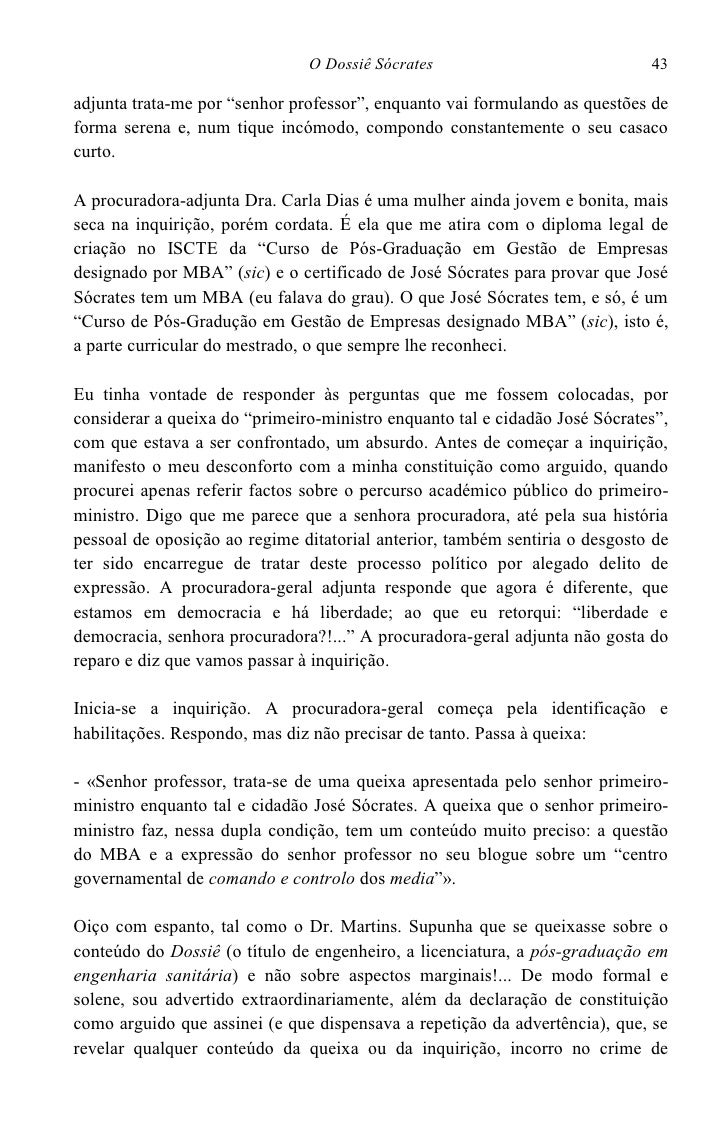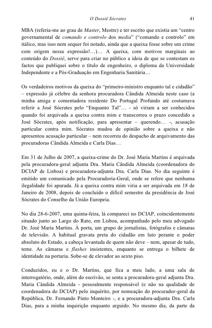 36. 36. O Dossiê Sócrates 41 MBA (referia-me ao grau de Master, Mestre) e ter escrito que existia um ―centro governamental de comando e controlo dos media‖ (―comando e controlo‖ em itálico, mas isso nem sequer foi notado, ainda que a queixa fosse sobre um crime com origem nessa expressão!…)… A queixa, com motivos marginais ao conteúdo do Dossiê, serve para criar no público a ideia de que se contestam os factos que publiquei sobre o título de engenheiro, o diploma da Universidade Independente e a Pós-Graduação em Engenharia Sanitária… Os verdadeiros motivos da queixa do ―primeiro-ministro enquanto tal e cidadão‖ – expressão já célebre da senhora procuradora Cândida Almeida neste caso (a minha amiga e comentadora residente Do Portugal Profundo até costumava referir a José Sócrates pelo ―Enquanto Tal‖… - só viriam a ser conhecidos quando foi arquivada a queixa contra mim e transcorreu o prazo concedido a José Sócrates, após notificação, para apresentar – querendo… -, acusação particular contra mim. Sócrates mudou de opinião sobre a queixa e não apresentou acusação particular – nem recorreu do despacho de arquivamento das procuradoras Cândida Almeida e Carla Dias… Em 31 de Julho de 2007, a queixa-crime do Dr. José Maria Martins é arquivada pela procuradora-geral adjunta Dra. Maria Cândida Almeida (coordenadora do DCIAP de Lisboa) e procuradora-adjunta Dra. Carla Dias. No dia seguinte é emitido um comunicado pela Procuradoria-Geral, onde se refere que nenhuma ilegalidade foi apurada. Já a queixa contra mim viria a ser arquivada em 18 de Janeiro de 2008, depois de concluído o difícil semestre da presidência de José Sócrates do Conselho da União Europeia. No dia 28-6-2007, uma quinta-feira, lá compareci no DCIAP, coincidentemente situado junto ao Largo do Rato, em Lisboa, acompanhado pelo meu advogado Dr. José Maria Martins. À porta, um grupo de jornalistas, fotógrafos e câmaras de televisão. A habitual gravata preta do cidadão em luto perante o poder absoluto do Estado, a cabeça levantada de quem não deve – nem, apesar de tudo, teme. As câmaras e flashes insistentes, enquanto se entrega o bilhete de identidade na portaria. Sobe-se de elevador ao sexto piso. Conduzidos, eu e o Dr. Martins, que fica a meu lado, a uma sala de interrogatório, onde, além do escrivão, se senta a procuradora-geral adjunta Dra. Maria Cândida Almeida - pessoalmente responsável (e não na qualidade de coordenadora do DCIAP) pelo inquérito, por nomeação do procurador-geral da República, Dr. Fernando Pinto Monteiro -, e a procuradora-adjunta Dra. Carla Dias, para a minha inquirição enquanto arguido. No mesmo dia, da parte da