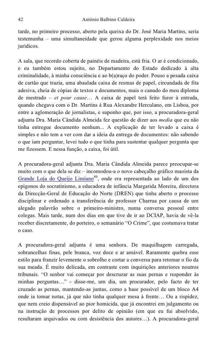 37. 37. 42 António Balbino Caldeira tarde, no primeiro processo, aberto pela queixa do Dr. José Maria Martins, seria testemunha – uma simultaneidade que gerou alguma perplexidade nos meios jurídicos. A sala, que recordo coberta de painéis de madeira, está fria. O ar é condicionado, e eu também estou sujeito, no Departamento do Estado dedicado à alta criminalidade, à minha consciência e ao b(a)raço do poder. Pouso a pesada caixa de cartão que trazia, uma abaulada caixa de resmas de papel, circundada de fita adesiva, cheia de cópias de textos e documentos, mais o canudo do meu diploma de mestrado – et pour cause… A caixa de papel terá feito furor à entrada, quando chegava com o Dr. Martins à Rua Alexandre Herculano, em Lisboa, por entre a aglomeração de jornalistas, e suponho que, por isso, a procuradora-geral adjunta Dra. Maria Cândida Almeida fez questão de dizer aos media que eu não tinha entregue documento nenhum... A explicação de ter levado a caixa é simples e não tem a ver com dar a ideia da entrega de documentos: não sabendo o que iam perguntar, levei tudo o que tinha para sustentar qualquer pergunta que me fizessem. E nessa função, a caixa, foi útil. A procuradora-geral adjunta Dra. Maria Cândida Almeida parece preocupar-se muito com o que dela se diz – incomodou-a o novo cabeçalho gráfico maoísta da Grande Loja do Queijo Limiano80, onde era representada ao lado de um dos epígonos do socratinismo, a educadora de infância Margarida Moreira, directora da Direcção-Geral de Educação do Norte (DREN) que tinha aberto o processo disciplinar e ordenado a transferência do professor Charrua por causa de um alegado palavrão sobre o primeiro-ministro, numa conversa pessoal entre colegas. Mais tarde, num dos dias em que tive de ir ao DCIAP, havia de vê-la receber discretamente, do porteiro, o semanário ―O Crime‖, que costumava tratar o caso. A procuradora-geral adjunta é uma senhora. De maquilhagem carregada, sobrancelhas finas, pele branca, voz doce e ar amável. Raramente quebra esse estilo para franzir levemente o sobrolho e cortar a conversa para retomar o fio da sua meada. É muito delicada, em contraste com inquirições anteriores noutros tribunais. ―O senhor vai começar por descruzar as suas pernas e responder às minhas perguntas…‖ - disse-me, um dia, um procurador, pelo facto de ter cruzado as pernas, mantendo-as juntas, como a base possível de um bloco A4 onde ia tomar notas, já que não tinha qualquer mesa à frente… Ou a rispidez, que nem creio dispensável ao pior homicida, que já encontrei em julgamento ou na instrução de processos por delito de opinião (em que eu fui absolvido, resultaram arquivados ou com desistência dos autores…). A procuradora-geral