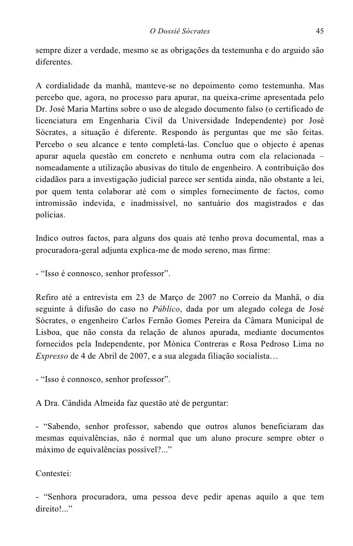 40. 40. O Dossiê Sócrates 45 sempre dizer a verdade, mesmo se as obrigações da testemunha e do arguido são diferentes. A cordialidade da manhã, manteve-se no depoimento como testemunha. Mas percebo que, agora, no processo para apurar, na queixa-crime apresentada pelo Dr. José Maria Martins sobre o uso de alegado documento falso (o certificado de licenciatura em Engenharia Civil da Universidade Independente) por José Sócrates, a situação é diferente. Respondo às perguntas que me são feitas. Percebo o seu alcance e tento completá-las. Concluo que o objecto é apenas apurar aquela questão em concreto e nenhuma outra com ela relacionada – nomeadamente a utilização abusivas do título de engenheiro. A contribuição dos cidadãos para a investigação judicial parece ser sentida ainda, não obstante a lei, por quem tenta colaborar até com o simples fornecimento de factos, como intromissão indevida, e inadmissível, no santuário dos magistrados e das polícias. Indico outros factos, para alguns dos quais até tenho prova documental, mas a procuradora-geral adjunta explica-me de modo sereno, mas firme: - ―Isso é connosco, senhor professor‖. Refiro até a entrevista em 23 de Março de 2007 no Correio da Manhã, o dia seguinte à difusão do caso no Público, dada por um alegado colega de José Sócrates, o engenheiro Carlos Fernão Gomes Pereira da Câmara Municipal de Lisboa, que não consta da relação de alunos apurada, mediante documentos fornecidos pela Independente, por Mónica Contreras e Rosa Pedroso Lima no Expresso de 4 de Abril de 2007, e a sua alegada filiação socialista… - ―Isso é connosco, senhor professor‖. A Dra. Cândida Almeida faz questão até de perguntar: - ―Sabendo, senhor professor, sabendo que outros alunos beneficiaram das mesmas equivalências, não é normal que um aluno procure sempre obter o máximo de equivalências possível?...‖ Contestei: - ―Senhora procuradora, uma pessoa deve pedir apenas aquilo a que tem direito!...‖