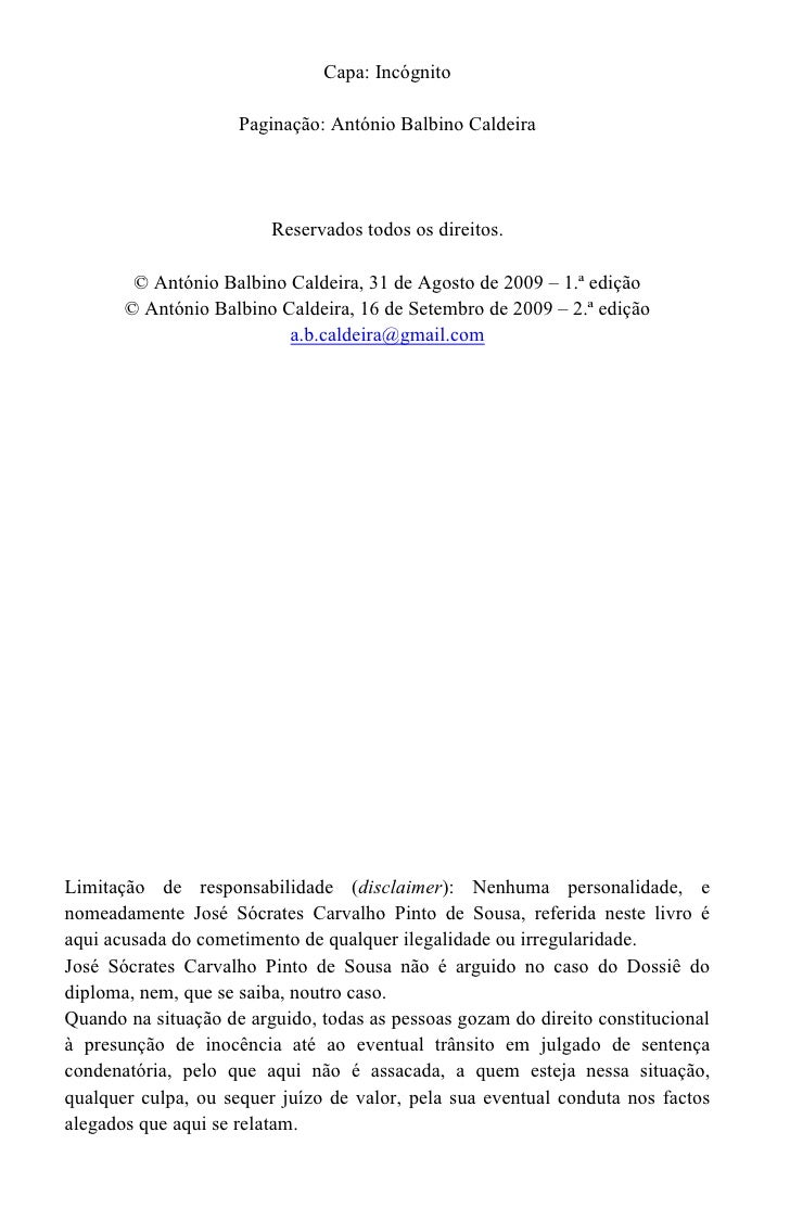 3. 3. Capa: Incógnito Paginação: António Balbino Caldeira Reservados todos os direitos. © António Balbino Caldeira, 31 de Agosto de 2009 – 1.ª edição © António Balbino Caldeira, 16 de Setembro de 2009 – 2.ª edição a.b.caldeira@gmail.com Limitação de responsabilidade (disclaimer): Nenhuma personalidade, e nomeadamente José Sócrates Carvalho Pinto de Sousa, referida neste livro é aqui acusada do cometimento de qualquer ilegalidade ou irregularidade. José Sócrates Carvalho Pinto de Sousa não é arguido no caso do Dossiê do diploma, nem, que se saiba, noutro caso. Quando na situação de arguido, todas as pessoas gozam do direito constitucional à presunção de inocência até ao eventual trânsito em julgado de sentença condenatória, pelo que aqui não é assacada, a quem esteja nessa situação, qualquer culpa, ou sequer juízo de valor, pela sua eventual conduta nos factos alegados que aqui se relatam.