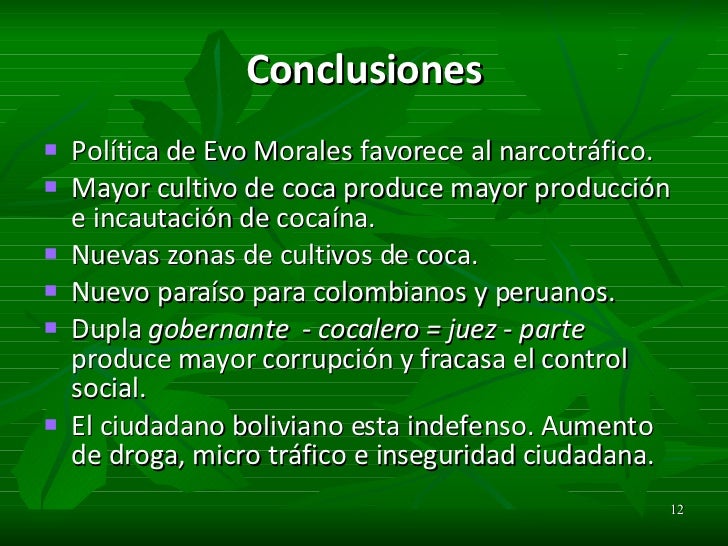 12. 12. Conclusiones <ul><li>Política de Evo Morales favorece al narcotráfico. </li></ul><ul><li>Mayor cultivo de coca produce mayor producción e incautación de cocaína. </li></ul><ul><li>Nuevas zonas de cultivos de coca. </li></ul><ul><li>Nuevo paraíso para colombianos y peruanos. </li></ul><ul><li>Dupla gobernante - cocalero = juez - parte produce mayor corrupción y fracasa el control social. </li></ul><ul><li>El ciudadano boliviano esta indefenso. Aumento de droga, micro tráfico e inseguridad ciudadana. </li></ul>