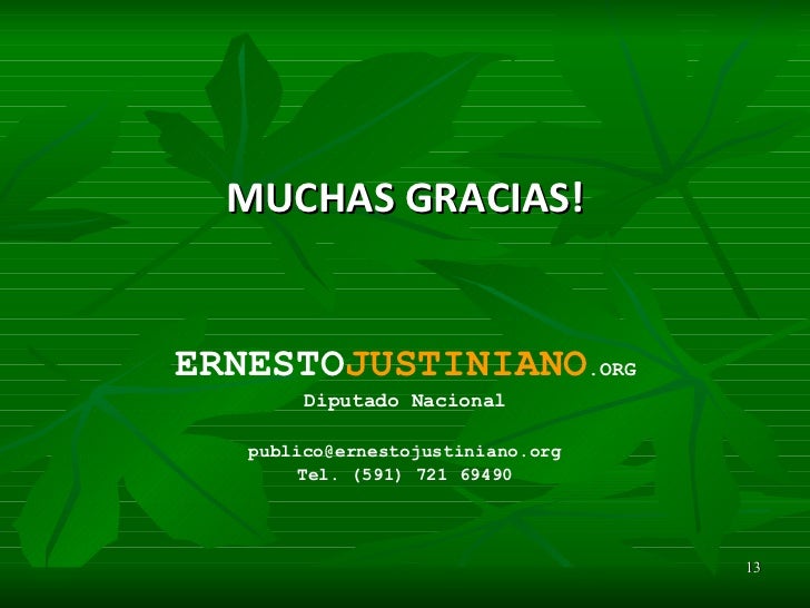13. 13. MUCHAS GRACIAS! ERNESTO JUSTINIANO .ORG Diputado Nacional [email_address] Tel. (591) 721 69490