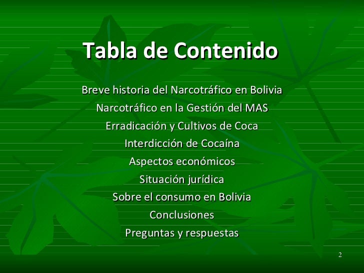 2. 2. Tabla de Contenido Breve historia del Narcotráfico en Bolivia Narcotráfico en la Gestión del MAS Erradicación y Cultivos de Coca Interdicción de Cocaína Aspectos económicos Situación jurídica Sobre el consumo en Bolivia Conclusiones Preguntas y respuestas