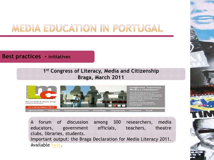 8. 8. Best practices - initiatives 1st Congress of Literacy, Media and Citizenship Braga, March 2011 A forum of discussion among 300 researchers, media educators, government officials, teachers, theatre clubs, libraries, students. Important output: the Braga Declaration for Media Literacy 2011. Available here.
