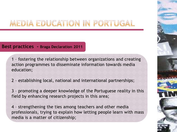 9. 9. Best practices - Braga Declaration 2011 1 – fostering the relationship between organizations and creating action programmes to disseminate information towards media education; 2 – establishing local, national and international partnerships; 3 – promoting a deeper knowledge of the Portuguese reality in this field by enhancing research projects in this area; 4 – strengthening the ties among teachers and other media professionals, trying to explain how letting people learn with mass media is a matter of citizenship;