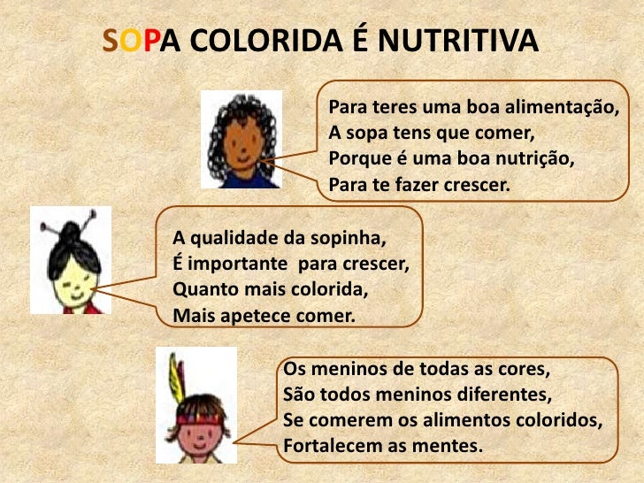 10. 10. SOPA COLORIDA É NUTRITIVA<br />A qualidade da sopinha,<br />É importante para crescer,<br />Quanto mais colorida,<br />Mais apetece comer.<br />Para teres uma boa alimentação,<br />A sopa tens que comer,<br />Porque é uma boa nutrição,<br />Para te fazer crescer.<br />Os meninos de todas as cores,<br />São todos meninos diferentes,<br />Se comerem os alimentos coloridos,<br />Fortalecem as mentes.<br />