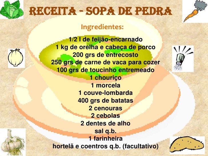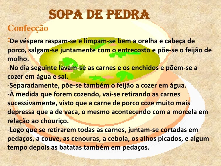Sopa de Pedra<br />Confecção:<br /><ul><li>De véspera raspam-se e limpam-se bem a orelha e cabeça de porco, salgam-se junt...