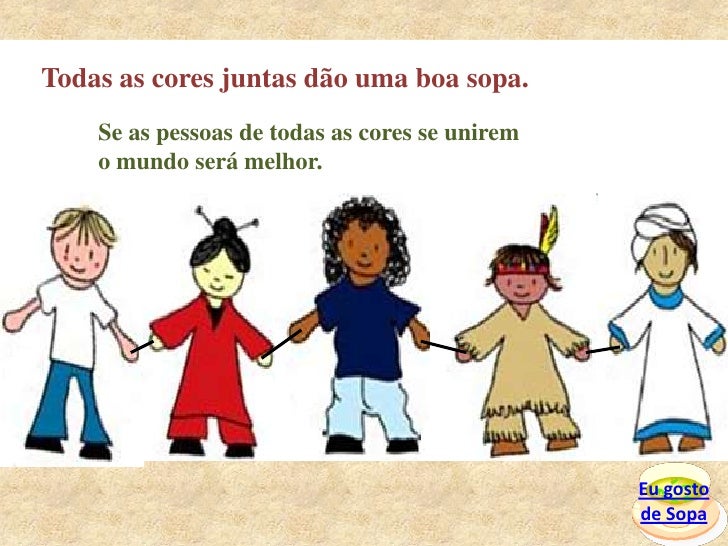 18. 18. Todas as cores juntas dão uma boa sopa.<br />Se as pessoas de todas as cores se unirem <br />o mundo será melhor.<br />Eu gosto <br />de Sopa<br />