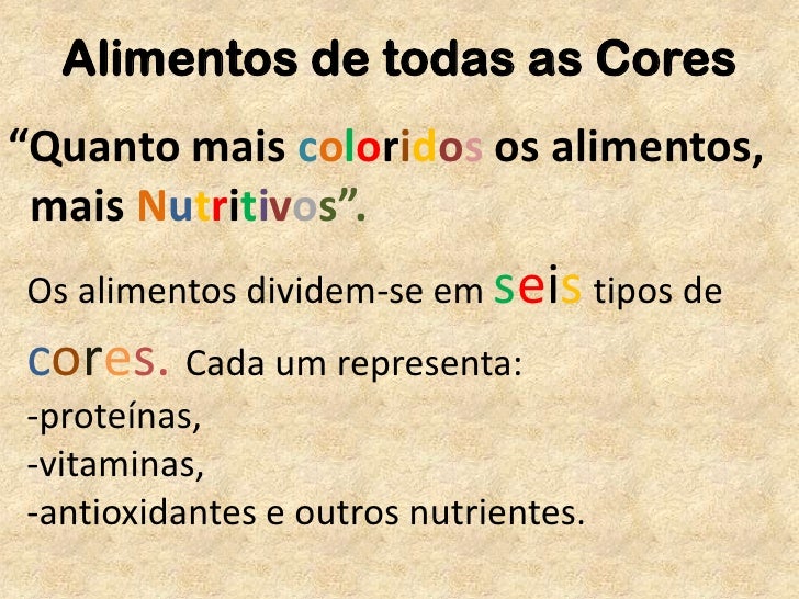 Alimentos de todas as Cores<br />“Quanto mais coloridos os alimentos, <br />  mais Nutritivos”.<br />Os alimentos dividem-...
