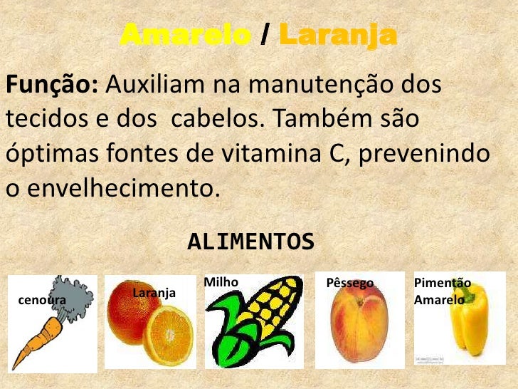 Amarelo / Laranja<br />Função: Auxiliam na manutenção dos tecidos e dos  cabelos. Também são óptimas fontes de vitamina C,...