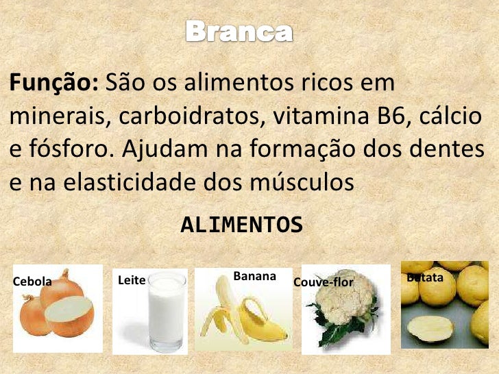 Branca<br />Função: São os alimentos ricos em minerais, carboidratos, vitamina B6, cálcio e fósforo. Ajudam na formação do...