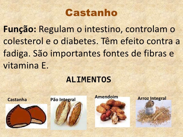 5. 5. Castanho<br />Função: Regulam o intestino, controlam o colesterol e o diabetes. Têm efeito contra a fadiga. São importantes fontes de fibras e vitamina E.<br />Arroz Integral<br />Amendoim<br />Castanha<br />Pão Integral<br />ALIMENTOS<br />
