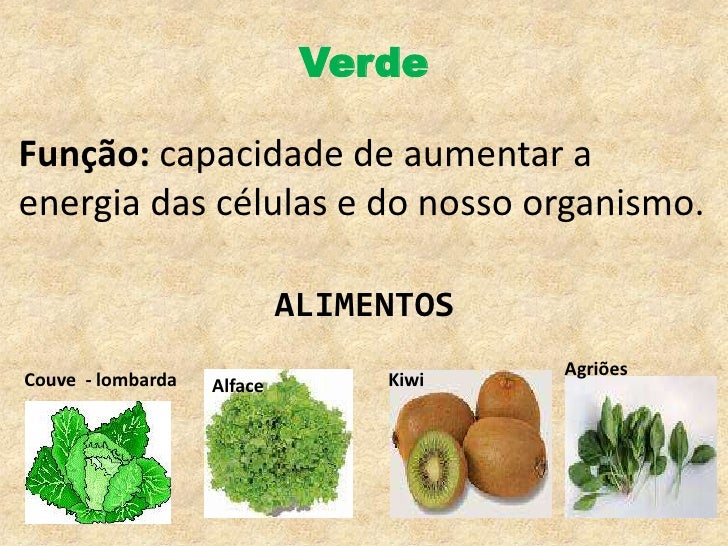 Verde<br />Couve  - lombarda<br />Função: capacidade de aumentar a energia das células e do nosso organismo. <br />Kiwi<br...
