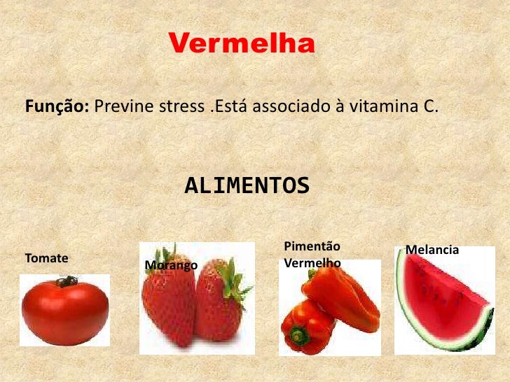 Vermelha<br />Função: Previne stress .Está associado à vitamina C.<br />ALIMENTOS<br />Melancia<br />Pimentão Vermelho<br ...