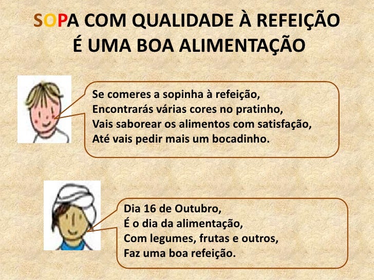 SOPA COM QUALIDADE À REFEIÇÃO<br /> É UMA BOA ALIMENTAÇÃO<br />Se comeres a sopinha à refeição,<br />Encontrarás várias co...