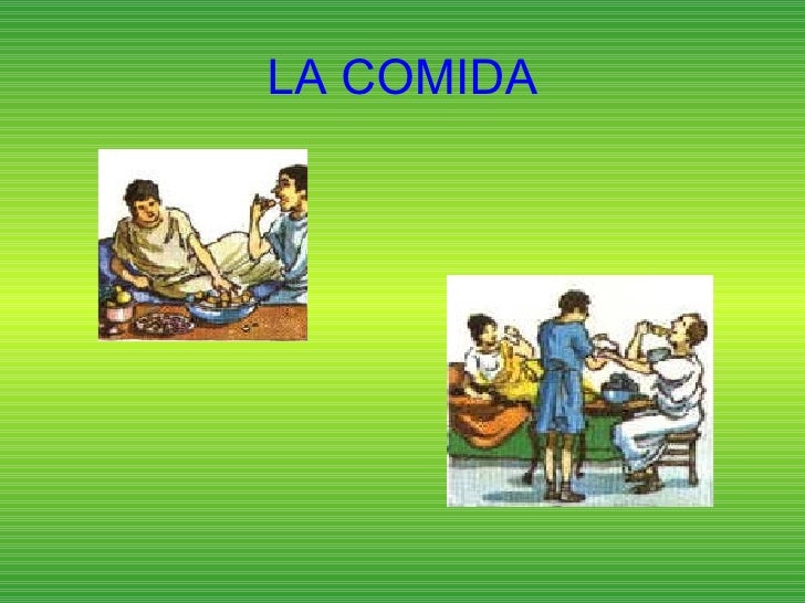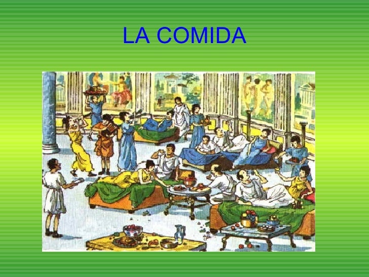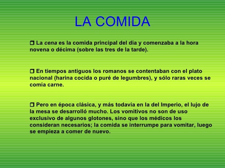 8. 13. LA COMIDA  La cena es la comida principal del día y comenzaba a la hora novena o décima (sobre las tres de la tarde).  En tiempos antiguos los romanos se contentaban con el plato nacional (harina cocida o puré de legumbres), y sólo raras veces se comía carne.  Pero en época clásica, y más todavía en la del Imperio, el lujo de la mesa se desarrolló mucho. Los vomitivos no son de uso exclusivo de algunos glotones, sino que los médicos los consideran necesarios; la comida se interrumpe para vomitar, luego se empieza a comer de nuevo.