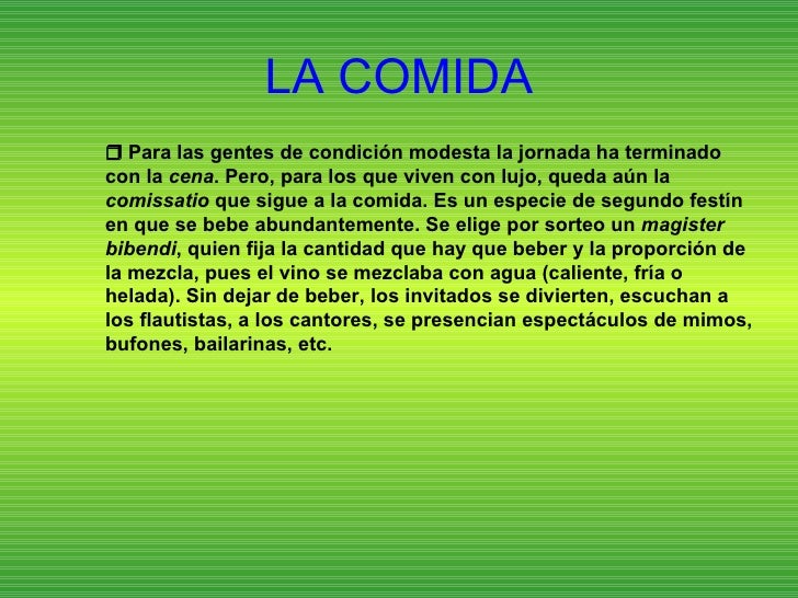 9. 14. LA COMIDA  Para las gentes de condición modesta la jornada ha terminado con la cena . Pero, para los que viven con lujo, queda aún la comissatio que sigue a la comida. Es un especie de segundo festín en que se bebe abundantemente. Se elige por sorteo un magister bibendi , quien fija la cantidad que hay que beber y la proporción de la mezcla, pues el vino se mezclaba con agua (caliente, fría o helada). Sin dejar de beber, los invitados se divierten, escuchan a los flautistas, a los cantores, se presencian espectáculos de mimos, bufones, bailarinas, etc.