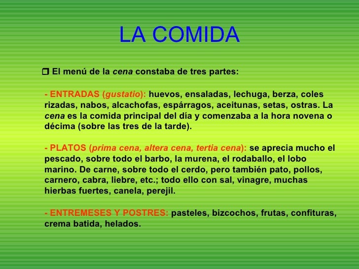 10. 15. LA COMIDA - ENTRADAS ( gustatio ): huevos, ensaladas, lechuga, berza, coles rizadas, nabos, alcachofas, espárragos, aceitunas, setas, ostras. La cena es la comida principal del día y comenzaba a la hora novena o décima (sobre las tres de la tarde). - PLATOS ( prima cena, altera cena, tertia cena ): se aprecia mucho el pescado, sobre todo el barbo, la murena, el rodaballo, el lobo marino. De carne, sobre todo el cerdo, pero también pato, pollos, carnero, cabra, liebre, etc.; todo ello con sal, vinagre, muchas hierbas fuertes, canela, perejil. - ENTREMESES Y POSTRES: pasteles, bizcochos, frutas, confituras, crema batida, helados.  El menú de la cena constaba de tres partes: