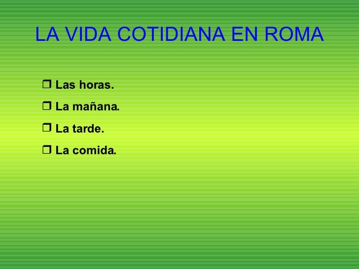 2. 2. LA VIDA COTIDIANA EN ROMA <ul><li>Las horas. </li></ul><ul><li>La mañana. </li></ul><ul><li>La tarde. </li></ul><ul><li>La comida. </li></ul>