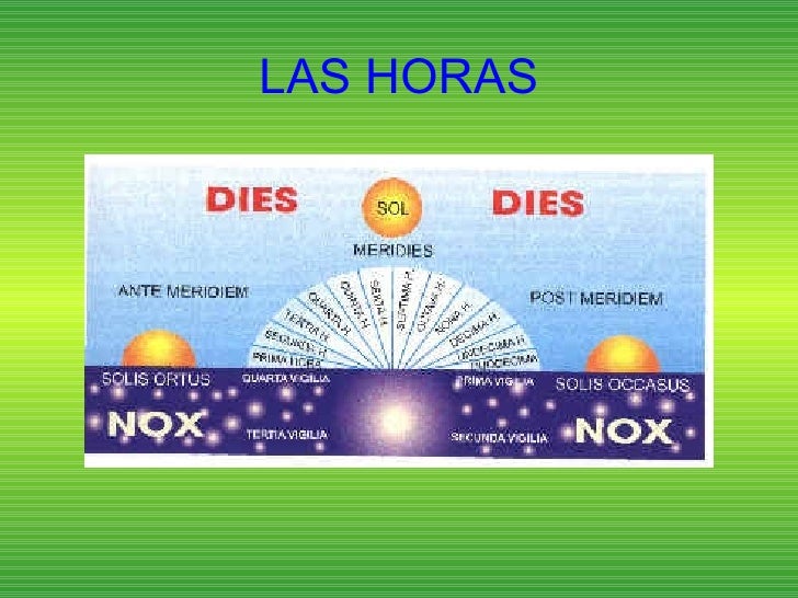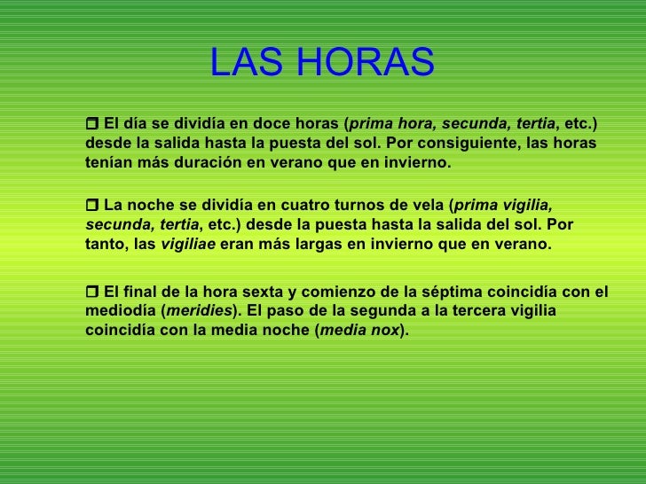 3. 3. LAS HORAS  El día se dividía en doce horas ( prima hora, secunda, tertia , etc.) desde la salida hasta la puesta del sol. Por consiguiente, las horas tenían más duración en verano que en invierno.  La noche se dividía en cuatro turnos de vela ( prima vigilia, secunda, tertia , etc.) desde la puesta hasta la salida del sol. Por tanto, las vigiliae eran más largas en invierno que en verano.  El final de la hora sexta y comienzo de la séptima coincidía con el mediodía ( meridies ). El paso de la segunda a la tercera vigilia coincidía con la media noche ( media nox ).