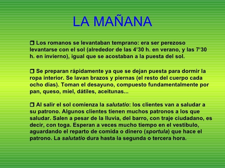 5. 5. LA MAÑANA  Los romanos se levantaban temprano: era ser perezoso levantarse con el sol (alrededor de las 4’30 h. en verano, y las 7’30 h. en invierno), igual que se acostaban a la puesta del sol.  Se preparan rápidamente ya que se dejan puesta para dormir la ropa interior. Se lavan brazos y piernas (el resto del cuerpo cada ocho días). Toman el desayuno, compuesto fundamentalmente por pan, queso, miel, dátiles, aceitunas...  Al salir el sol comienza la salutatio : los clientes van a saludar a su patrono. Algunos clientes tienen muchos patronos a los que saludar. Salen a pesar de la lluvia, del barro, con traje ciudadano, es decir, con toga. Esperan a veces mucho tiempo en el vestíbulo, aguardando el reparto de comida o dinero ( sportula ) que hace el patrono. La salutatio dura hasta la segunda o tercera hora.