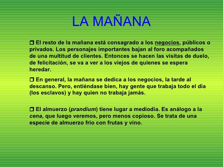 6. 6. LA MAÑANA  El resto de la mañana está consagrado a los negocios , públicos o privados. Los personajes importantes bajan al foro acompañados de una multitud de clientes. Entonces se hacen las visitas de duelo, de felicitación, se va a ver a los viejos de quienes se espera heredar.  En general, la mañana se dedica a los negocios, la tarde al descanso. Pero, entiéndase bien, hay gente que trabaja todo el día (los esclavos) y hay quien no trabaja jamás.   El almuerzo ( prandium ) tiene lugar a mediodía. Es análogo a la cena , que luego veremos, pero menos copioso. Se trata de una especie de almuerzo frío con frutas y vino.
