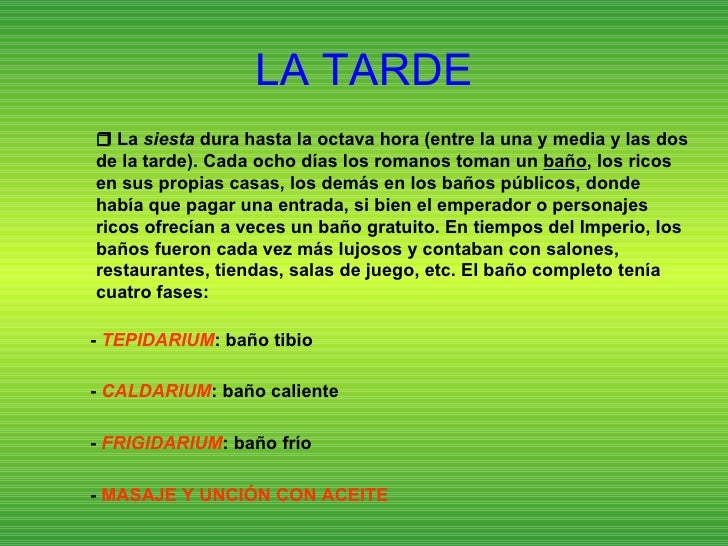 7. 7. LA TARDE  La siesta dura hasta la octava hora (entre la una y media y las dos de la tarde). Cada ocho días los romanos toman un baño , los ricos en sus propias casas, los demás en los baños públicos, donde había que pagar una entrada, si bien el emperador o personajes ricos ofrecían a veces un baño gratuito. En tiempos del Imperio, los baños fueron cada vez más lujosos y contaban con salones, restaurantes, tiendas, salas de juego, etc. El baño completo tenía cuatro fases: - TEPIDARIUM : baño tibio - CALDARIUM : baño caliente - FRIGIDARIUM : baño frío - MASAJE Y UNCIÓN CON ACEITE