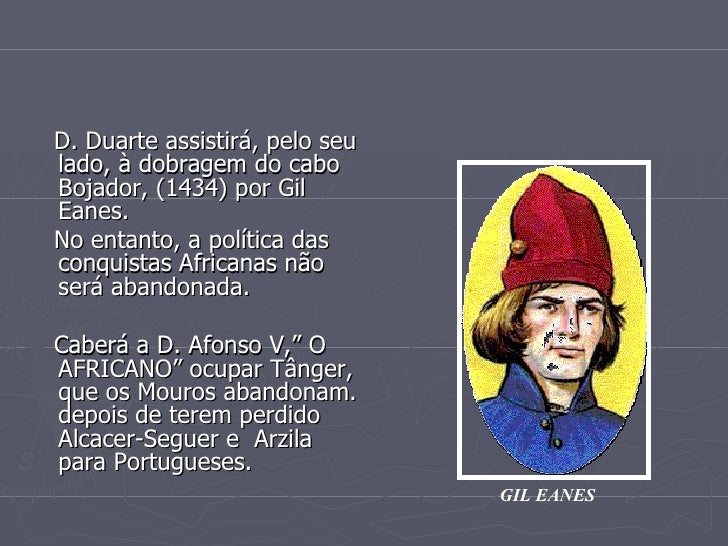 10. 10. <ul><li>D. Duarte assistirá, pelo seu lado, à dobragem do cabo Bojador, (1434) por Gil Eanes. </li></ul><ul><li>No entanto, a política das conquistas Africanas não será abandonada. </li></ul><ul><li>Caberá a D. Afonso V,” O AFRICANO” ocupar Tânger, que os Mouros abandonam. depois de terem perdido Alcacer-Seguer e Arzila para Portugueses. </li></ul>GIL EANES