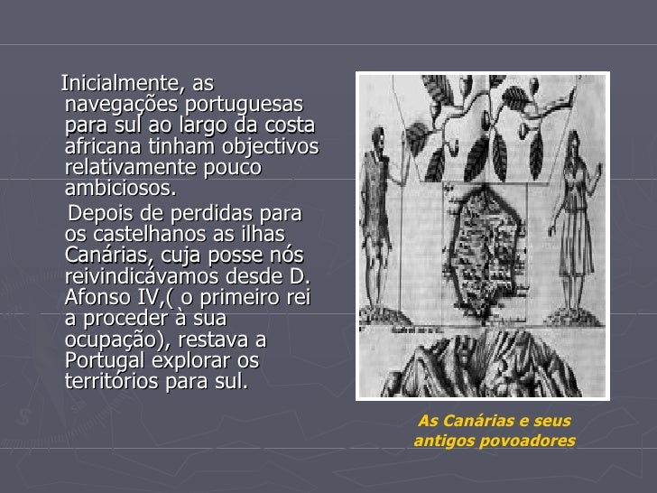 12. 12. <ul><li>Inicialmente, as navegações portuguesas para sul ao largo da costa africana tinham objectivos relativamente pouco ambiciosos. </li></ul><ul><li>Depois de perdidas para os castelhanos as ilhas Canárias, cuja posse nós reivindicávamos desde D. Afonso IV,( o primeiro rei a proceder à sua ocupação), restava a Portugal explorar os territórios para sul. </li></ul>As Canárias e seus antigos povoadores