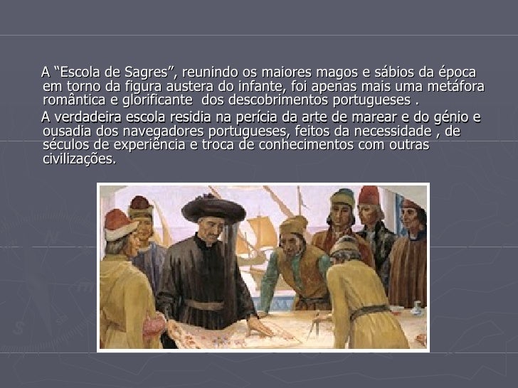15. 15. <ul><li>A “Escola de Sagres”, reunindo os maiores magos e sábios da época em torno da figura austera do infante, foi apenas mais uma metáfora romântica e glorificante dos descobrimentos portugueses . </li></ul><ul><li>A verdadeira escola residia na perícia da arte de marear e do génio e ousadia dos navegadores portugueses, feitos da necessidade , de séculos de experiência e troca de conhecimentos com outras civilizações. </li></ul>