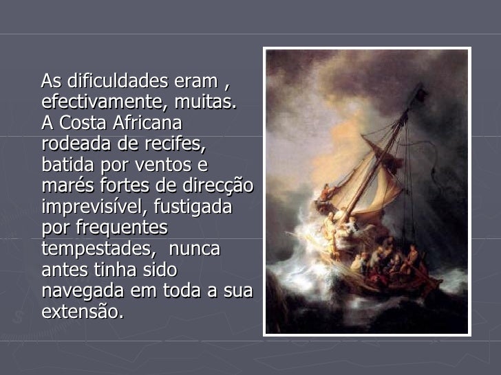16. 16. <ul><li>As dificuldades eram , efectivamente, muitas. A Costa Africana rodeada de recifes, batida por ventos e marés fortes de direcção imprevisível, fustigada por frequentes tempestades, nunca antes tinha sido navegada em toda a sua extensão. </li></ul>