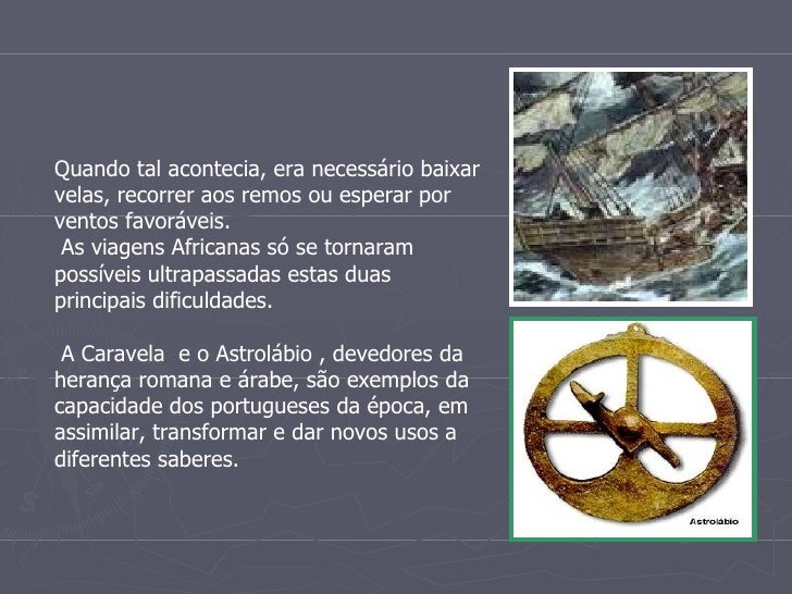 18. 18. Quando tal acontecia, era necessário baixar velas, recorrer aos remos ou esperar por ventos favoráveis. As viagens Africanas só se tornaram possíveis ultrapassadas estas duas principais dificuldades. A Caravela e o Astrolábio , devedores da herança romana e árabe, são exemplos da capacidade dos portugueses da época, em assimilar, transformar e dar novos usos a diferentes saberes.